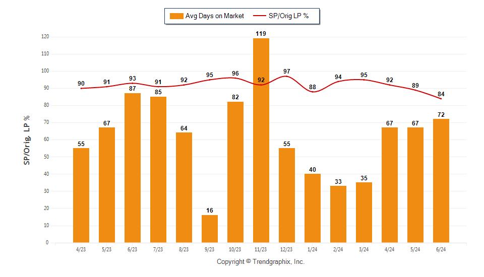 The average Days on Market (DOM) shows how many days the average property is on the market before it sells. An upward trend in DOM trends to indicate a move towards more of a Buyer’s market, a downward trend indicates a move towards more of a Seller’s market. The DOM for June 2024 was 72, up 7.5% from 67 days last month and down 17.2% from 87 days in June of last year.