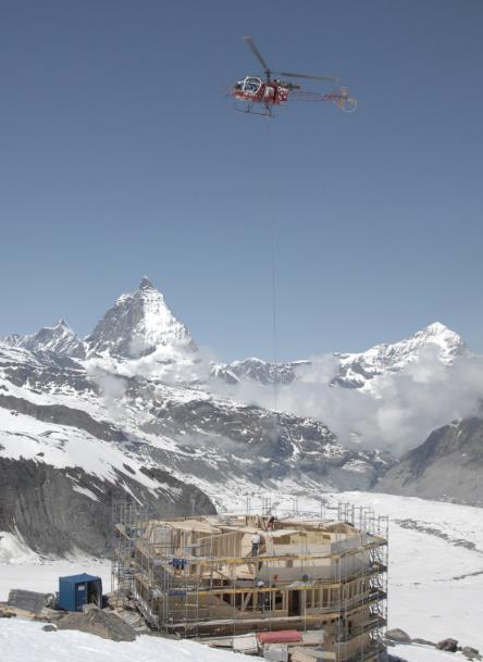 Az egész bivakot előre egy völgyben lévő műhelyben gyártották le és szerelték össze. A szétszerelt, keresztbe rétegelt paneleket ezután helikopterrel szállították a helyszínre. A szállítás lehetővé tétele érdekében 20 hasonló súlyú csomagra osztották őket.