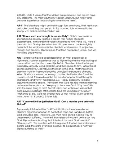 2:19-20), while it seems that the wicked are prosperous and do not have any problems. This man’s authority was not Scripture, but history and personal experience “according to what I have seen”. 4:9-11 The idea here might be that though lions are strong, their teeth can be broken, and they can perish. In like manner, Job, who used to be strong, was broken and his children lost. 4:12 “Now a word was brought to me stealthily”: Eliphaz now seeks to strengthen his case by relating a dream that he has allegedly experienced. In this dream a voice whispered to him (verse 17). Here is the claim that God spoke to him in a still, quiet voice. Jackson rightly notes that this section reveals the absolute worthlessness of subjective feelings and dreams. Eliphaz is sure that God has spoken to him, and yet he will be dead wrong. 4:13-16 Here we have a good description of what people call a nightmare. Such an experience was so frightening that he was shaking all over and his hair stood up on end (4:14-15). Then he claims that a spirit passed by, actually stood still (4:16), and then spoke to him. While this all sounds impressive, God rebukes this man in the end. “Nothing is more essential than testing experience by an objective standard of reality. When God has spoken concerning a matter, that is decisive for all the issues involved. This word must be the court of appeal for all thoughts, impressions, and views” (Jackson p. 36). Today people try to make arguments like the above. They claim that God has told them something, but one writer reminds us. “We pray to the same God. Why hasn’t He said the same thing to me? Secret visions and whispered voices that bring private messages attributed to God are immediately suspect” (McKenna p. 61). God has already told us that He has given us all the truth (John 16:13; Jude 3; 2 Peter 1:3). 4:17 “Can mankind be just before God? Can a man be pure before his Maker?” Supposedly this is what the “spirit” said to him in the above dream. Eliphaz’s argument appears to be that no man can stand pure before God, including Job. Therefore, Job must have sinned in some way to deserve such suffering. “No one is blameless or innocent before our holy God. Eliphaz is emphasizing that Job should accept God’s verdict” (Strauss p. 41) The question with this argument, that no one is blameless before God, therefore everyone deserves to be punished, is “Why isn’t Eliphaz suffering as well?”