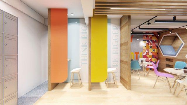 Interior design (from left to right) : reception area; working pods, collaboration area. & conference room
