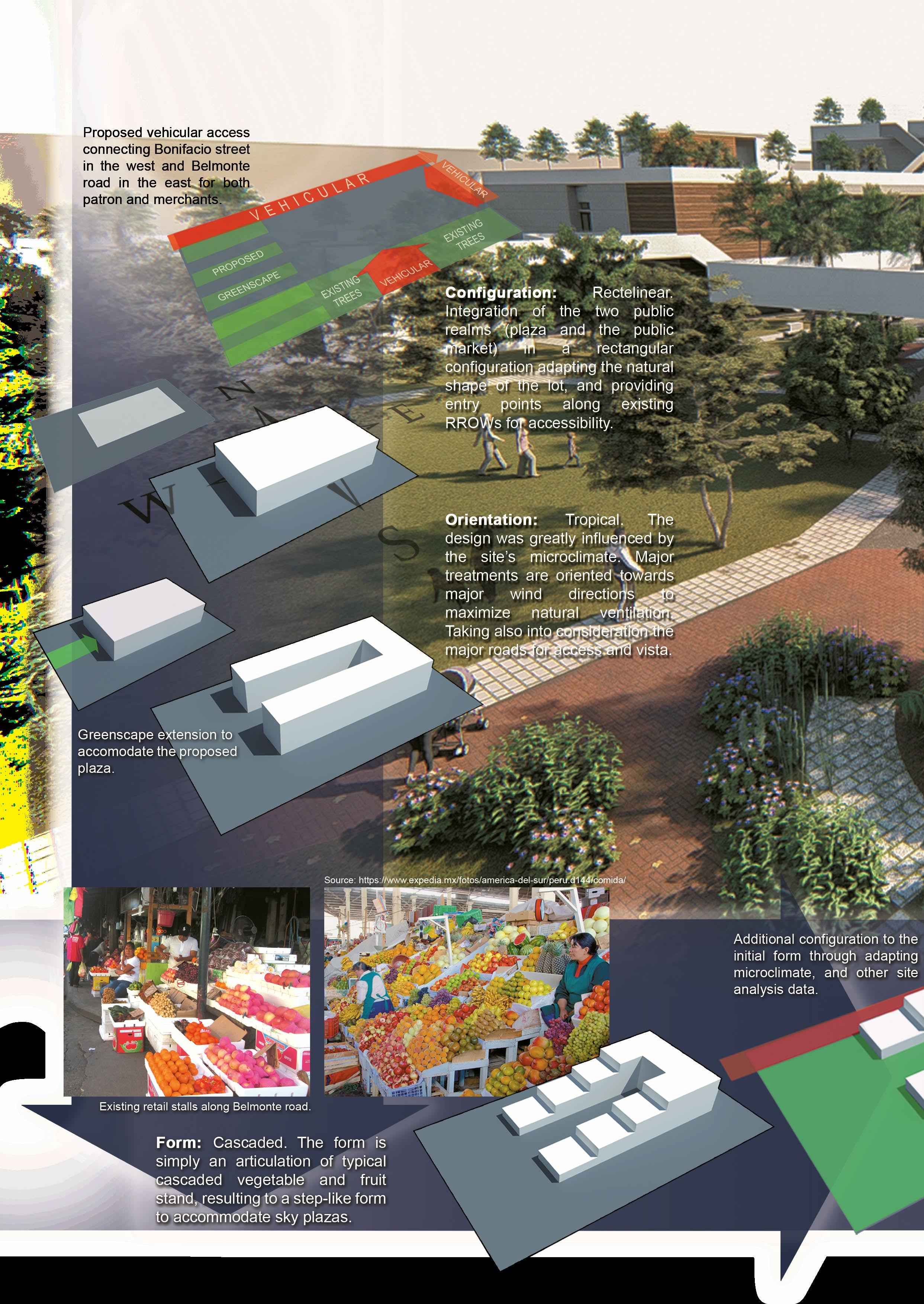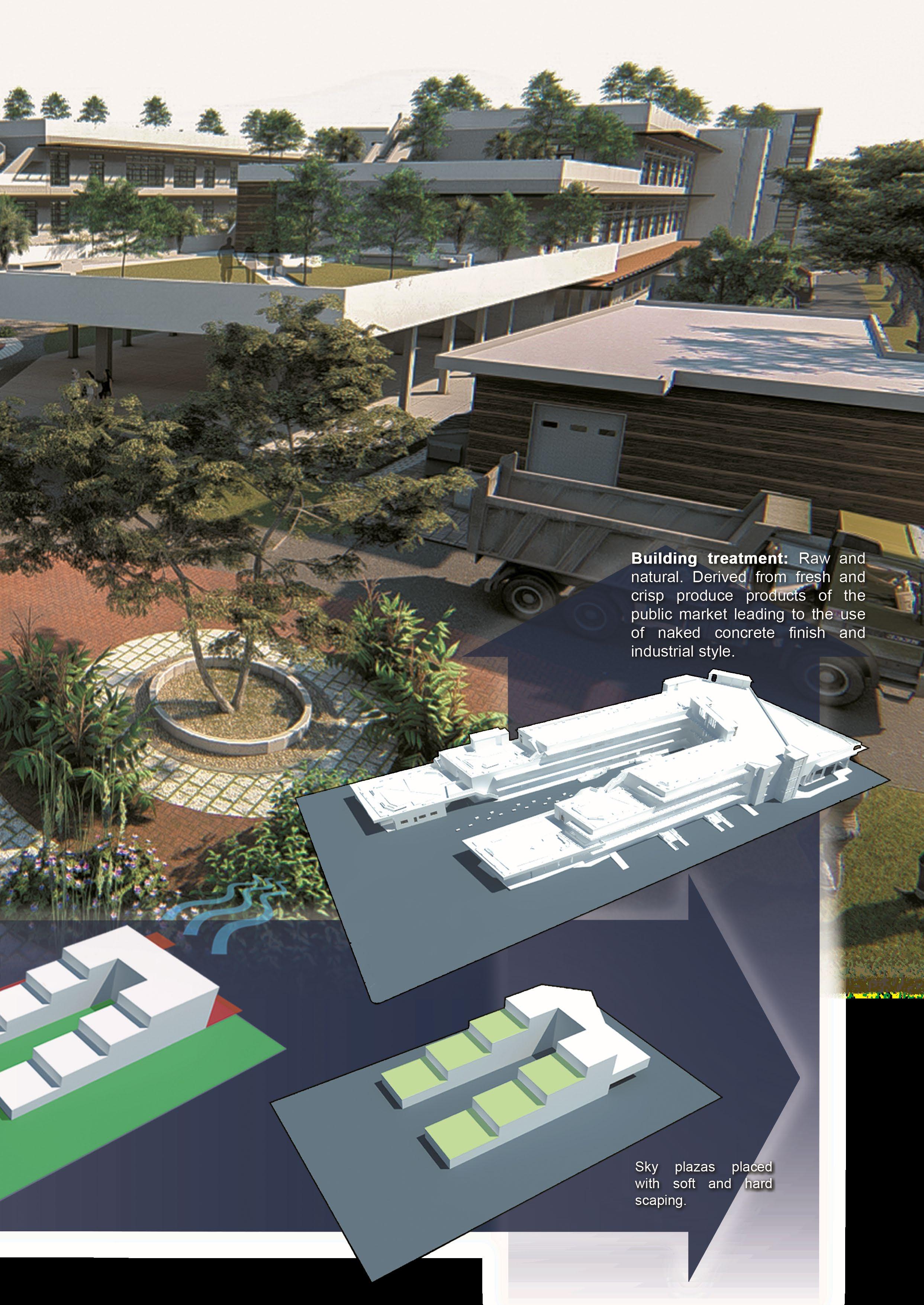 To create an integrated public realm complex by the juxtaposition of the public market and the plaza, where both spaces having the same socio-cultural nature but different in function to compliment each other; wherein the public market highlights the openness & verdant plaza, where at the same time the plaza supports the public market through attracting people & patrons.