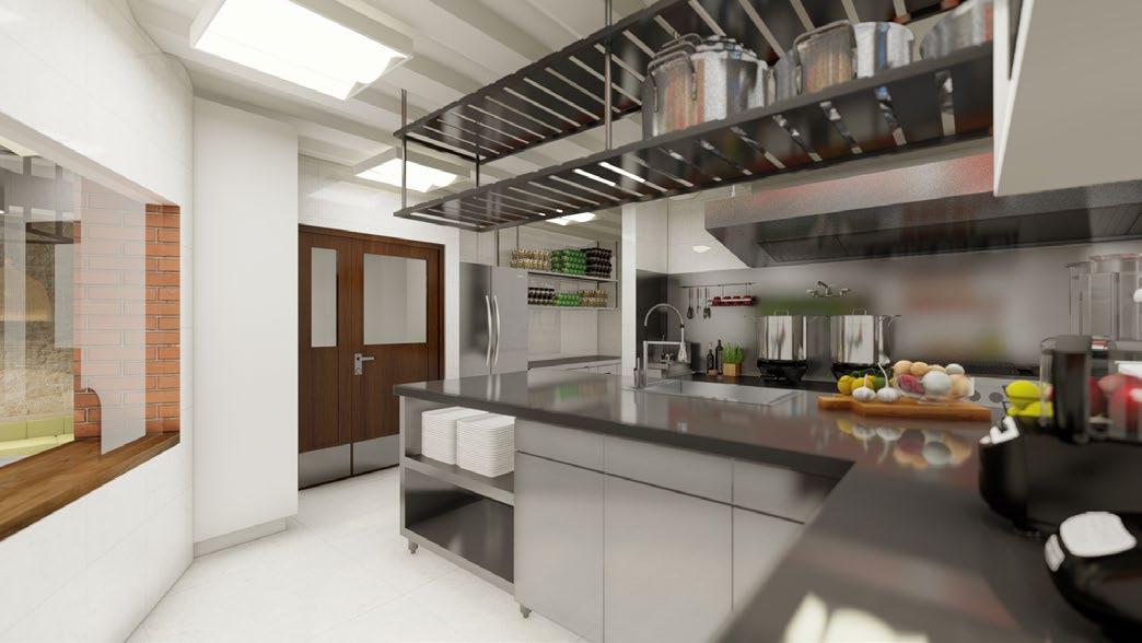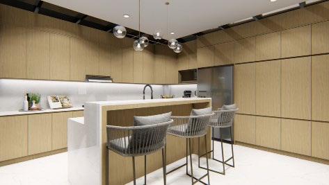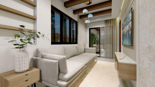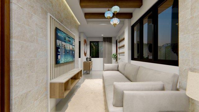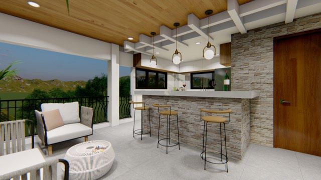 Interior design (from left to right) : living area; roof deck w/ bar; and kitchen.