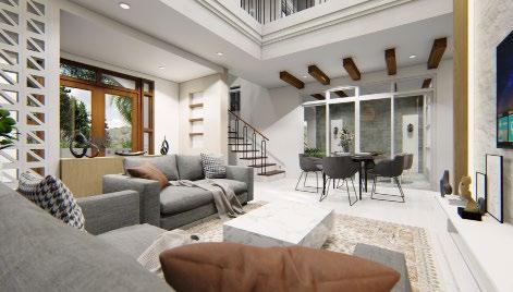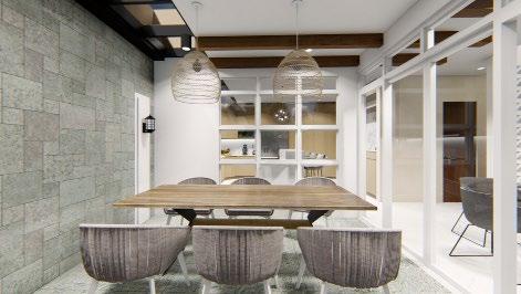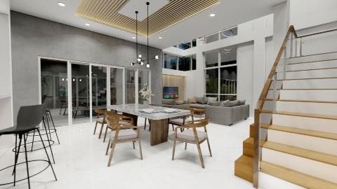 Interior rendering (from left to right) : living area; dining area; kitchen; and outdoor dining/lanai.