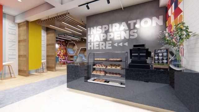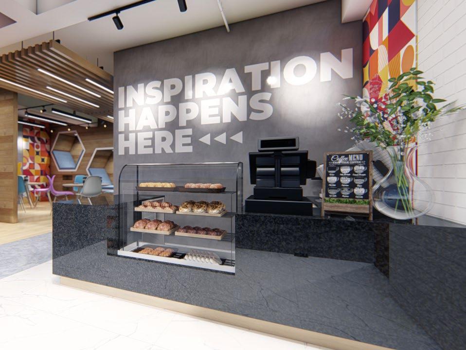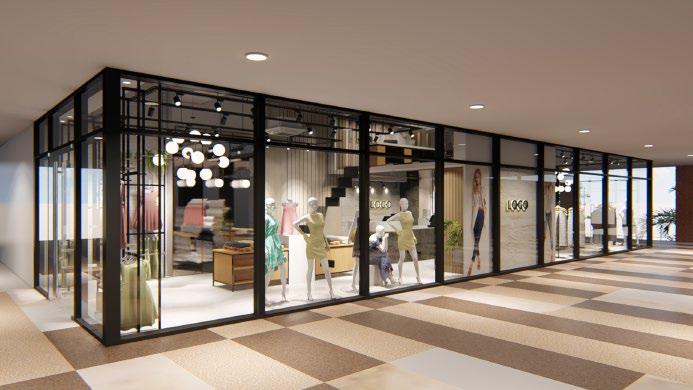 From left to right: lounge area; checkout counter; display area; and mezzanine office..