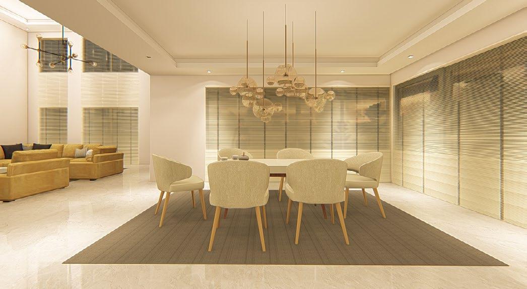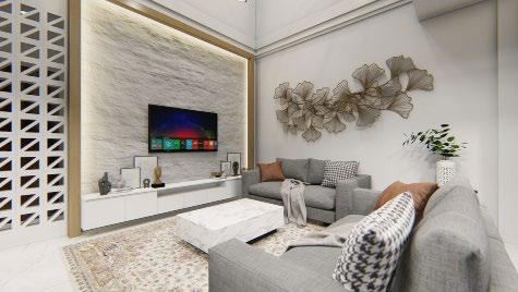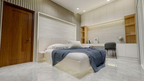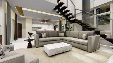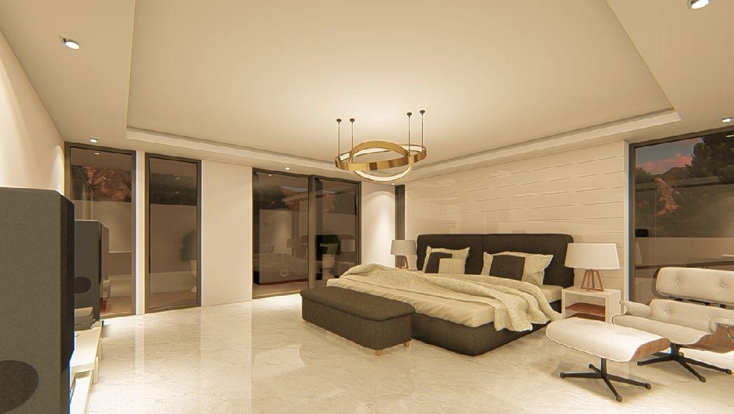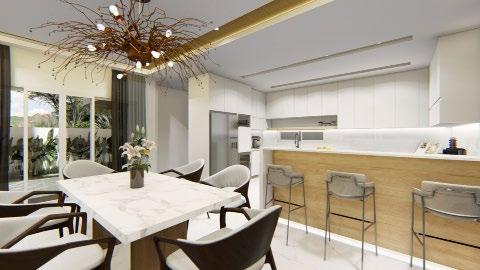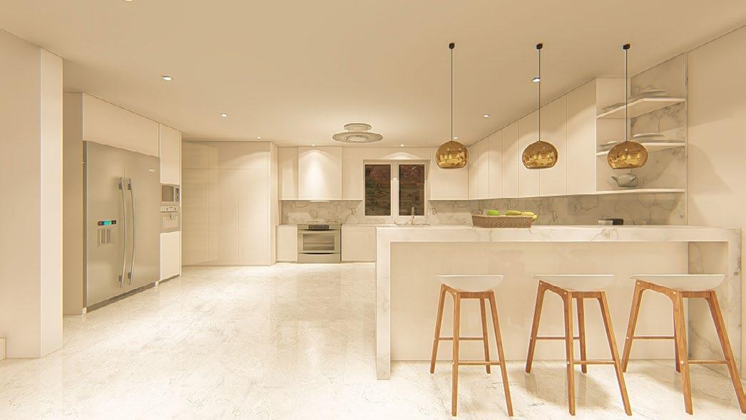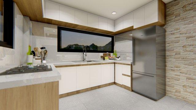 Interior rendering (from left to right) : living area; dining area; master’s bedroom; and kitchen.