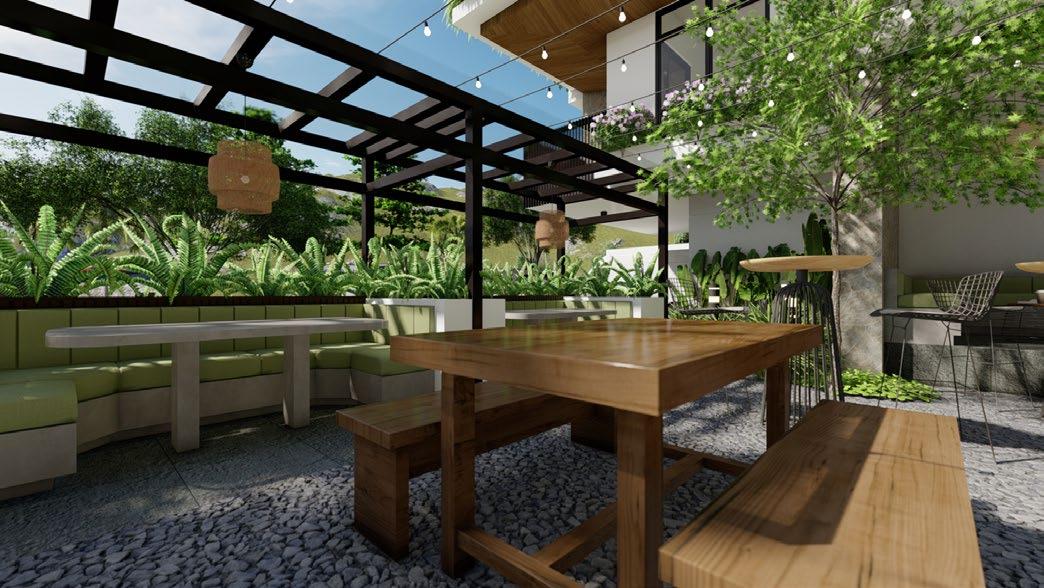 Al fresco banquette seat, cafe counter, kitchen, al fresco roof deck (from left to right).
