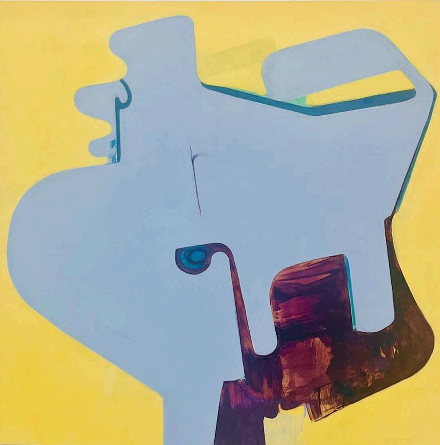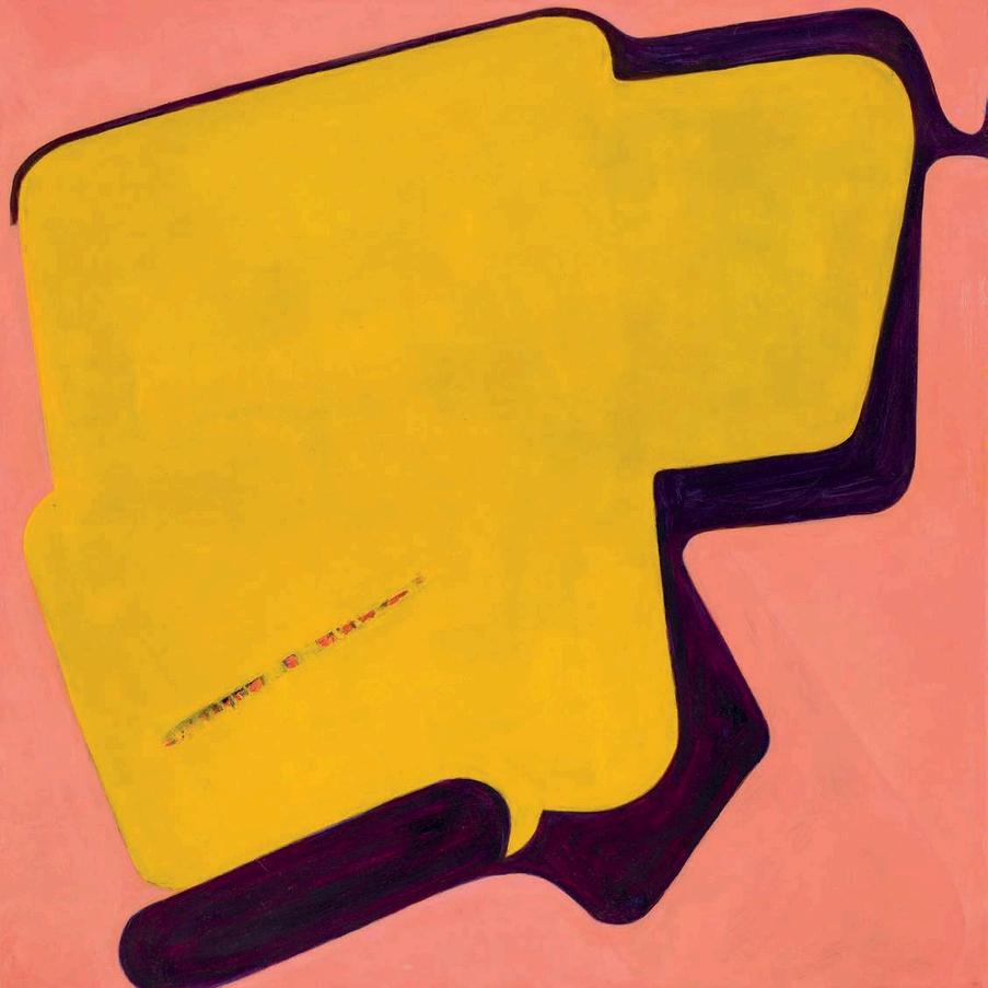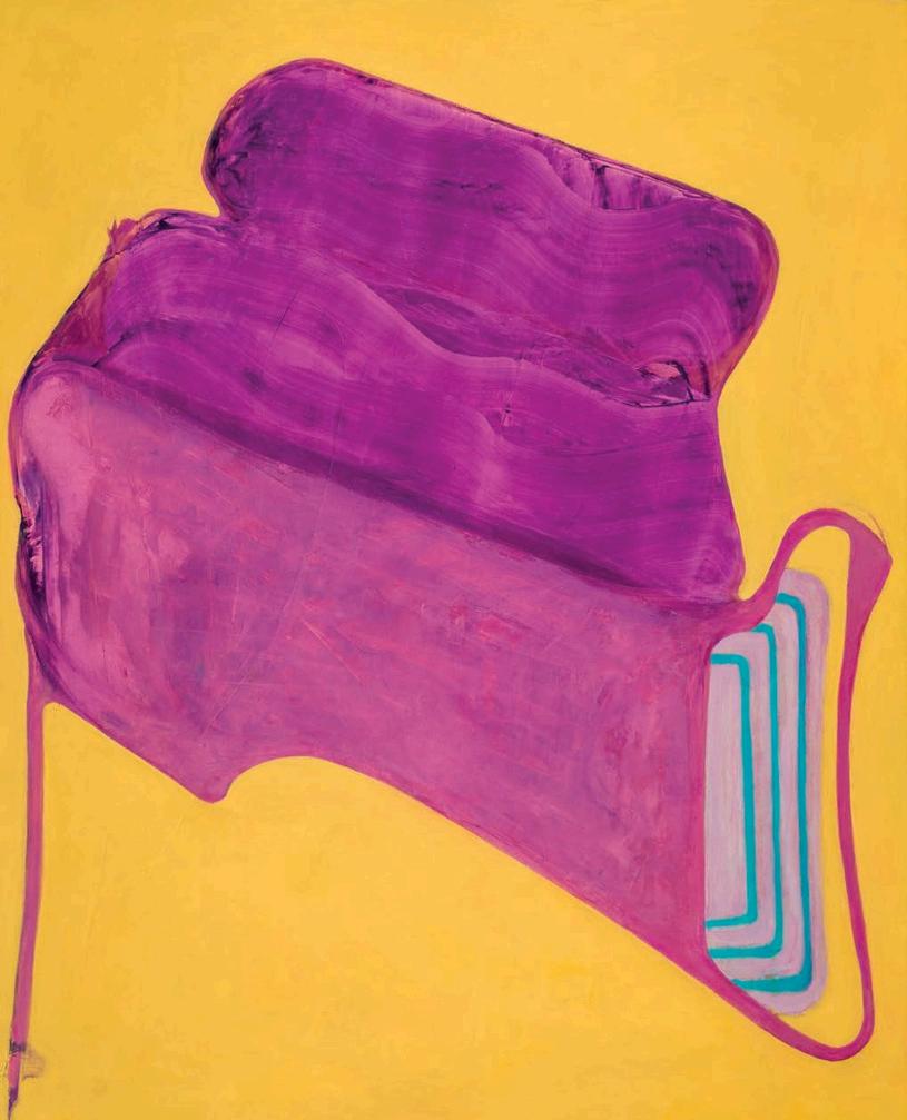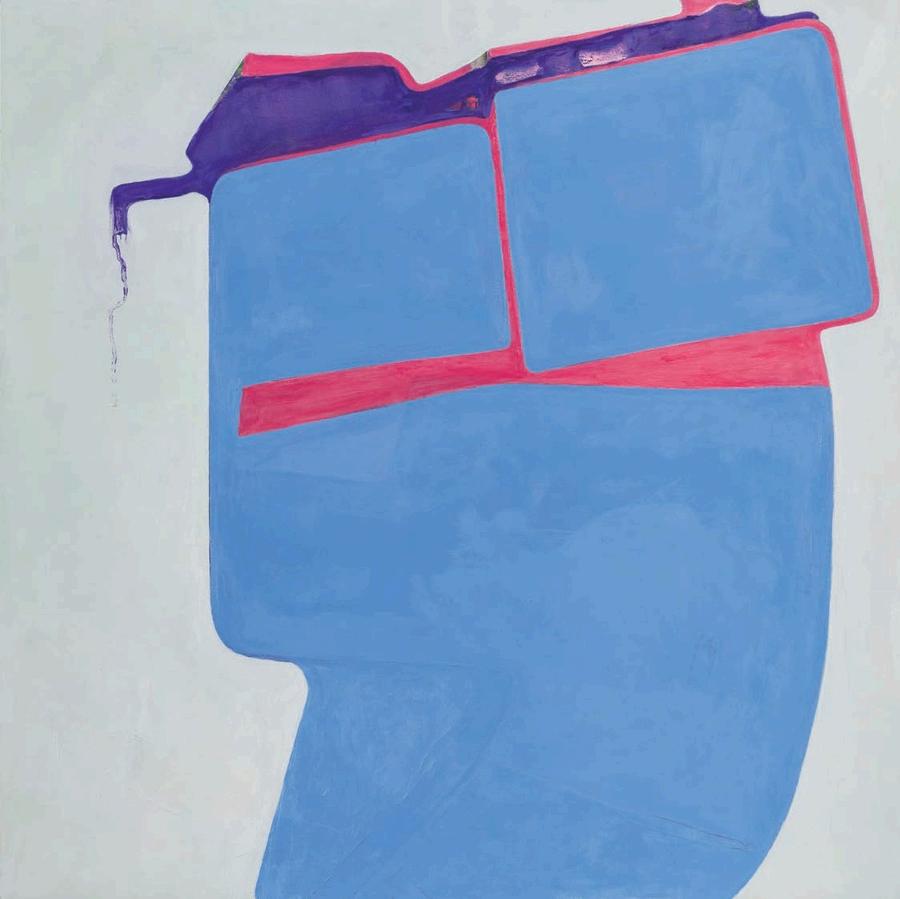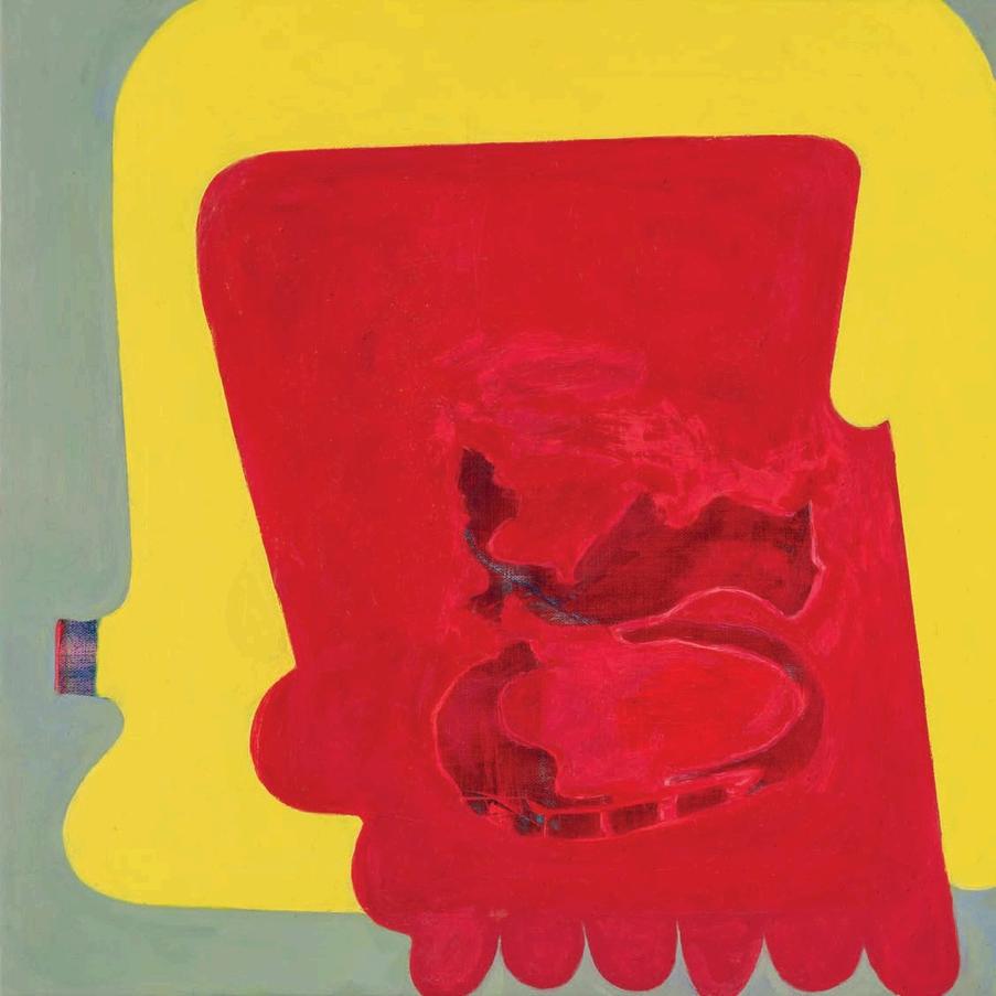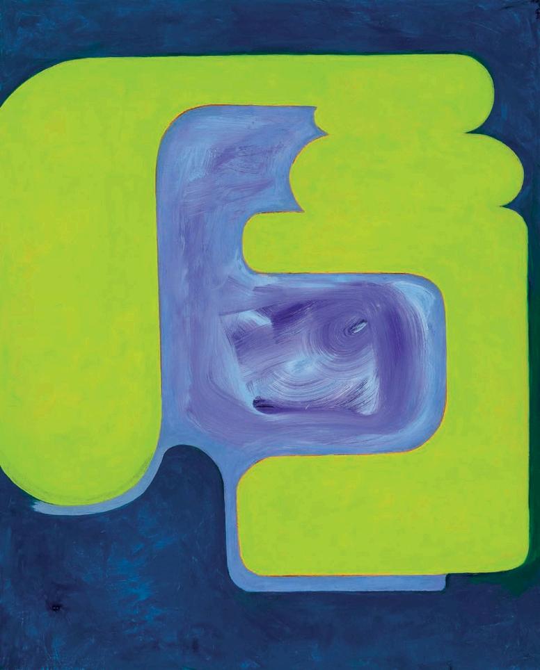 offset by a bright yellow drop shadow that cuts out the surrounding negat ve space. Forgetting the Self contains a d rty magenta biomorphic head-like form propped up by a phthalo blue grooved neck, framed by a white negative space It is strange mysterious and highly evocat ve A l three paint ngs emphasize their history Successive ayers of paint create muted passages, which at times, expose transparent underpaintings that act as visual breadcrumbs wa king the viewer through labor, time, and decision mak ng.
