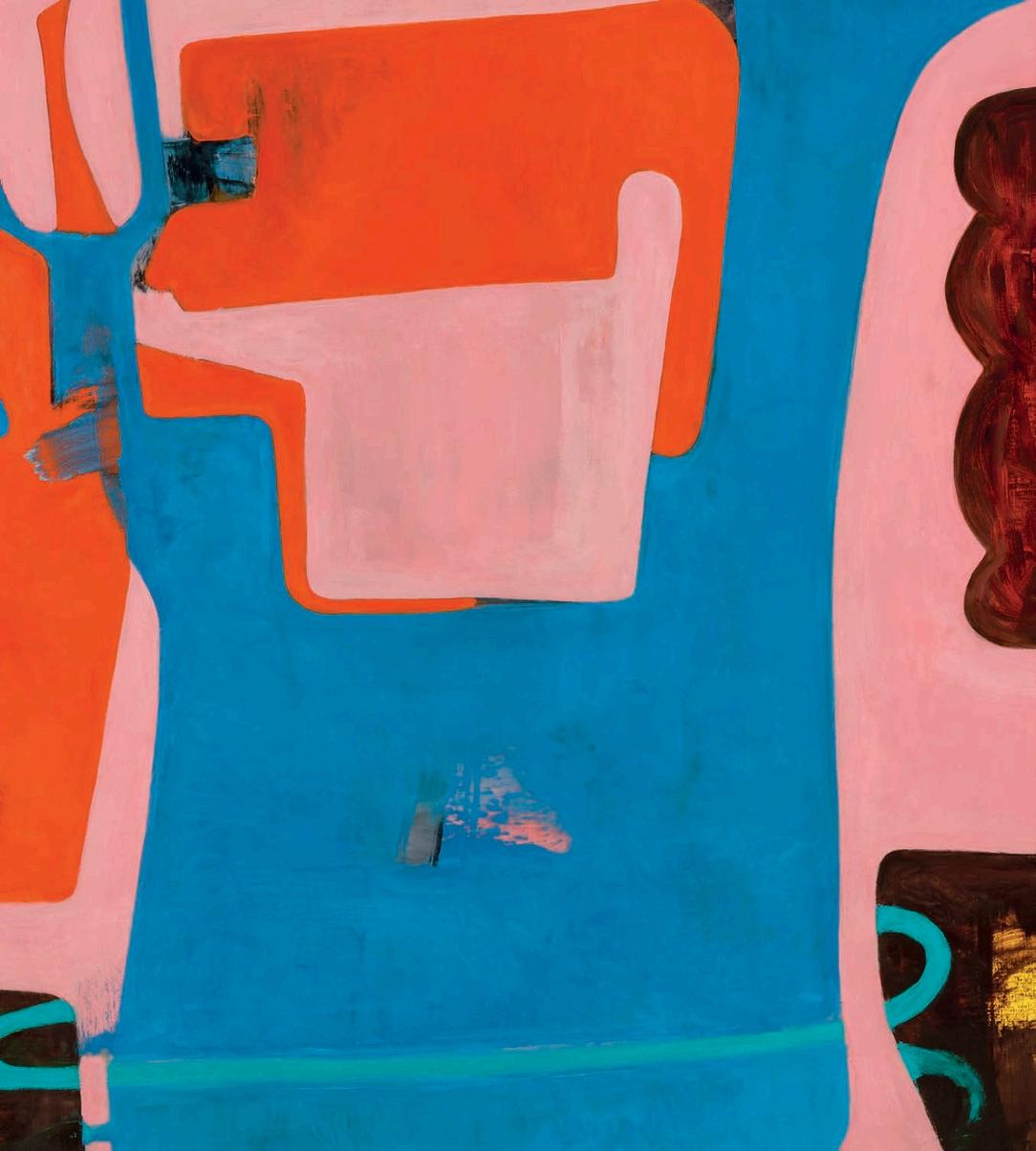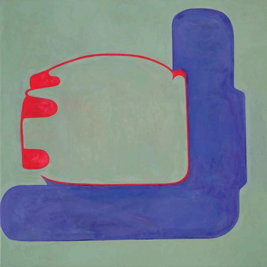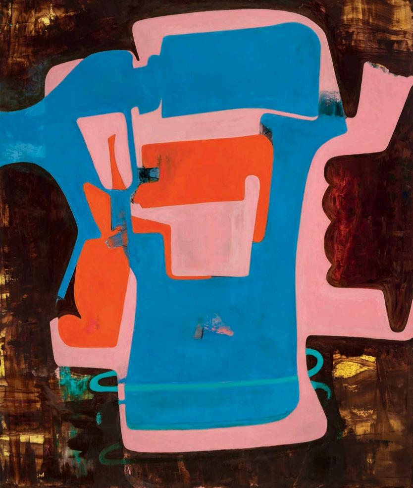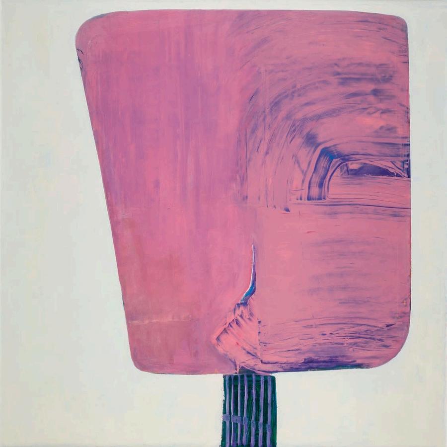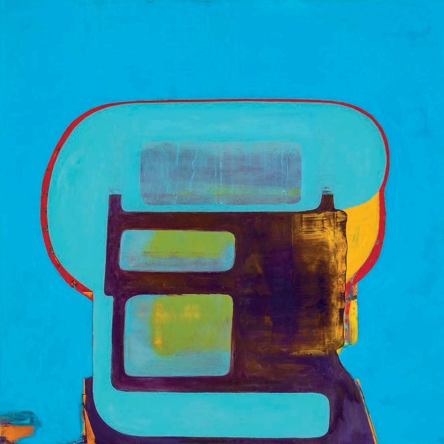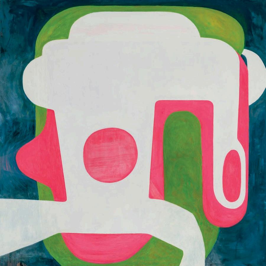 offset by a bright yellow drop shadow that cuts out the surrounding negat ve space. Forgetting the Self contains a d rty magenta biomorphic head-like form propped up by a phthalo blue grooved neck, framed by a white negative space It is strange mysterious and highly evocat ve A l three paint ngs emphasize their history Successive ayers of paint create muted passages, which at times, expose transparent underpaintings that act as visual breadcrumbs wa king the viewer through labor, time, and decision mak ng.