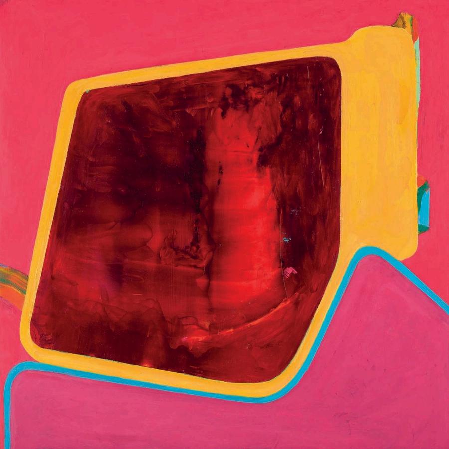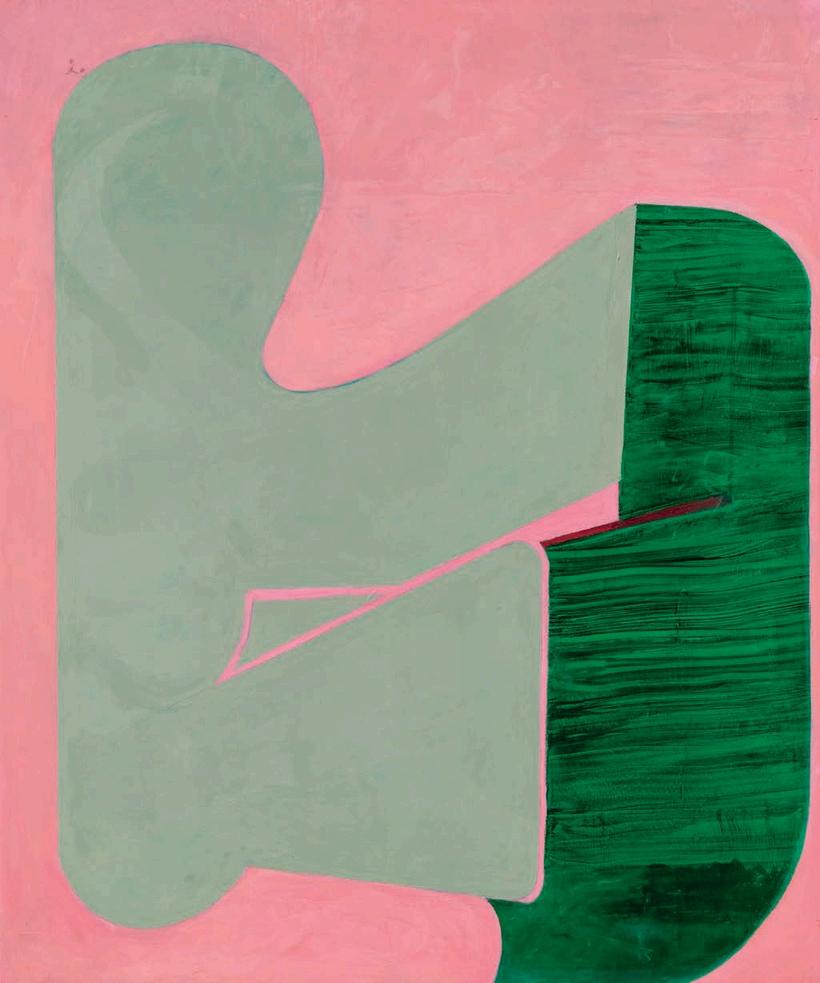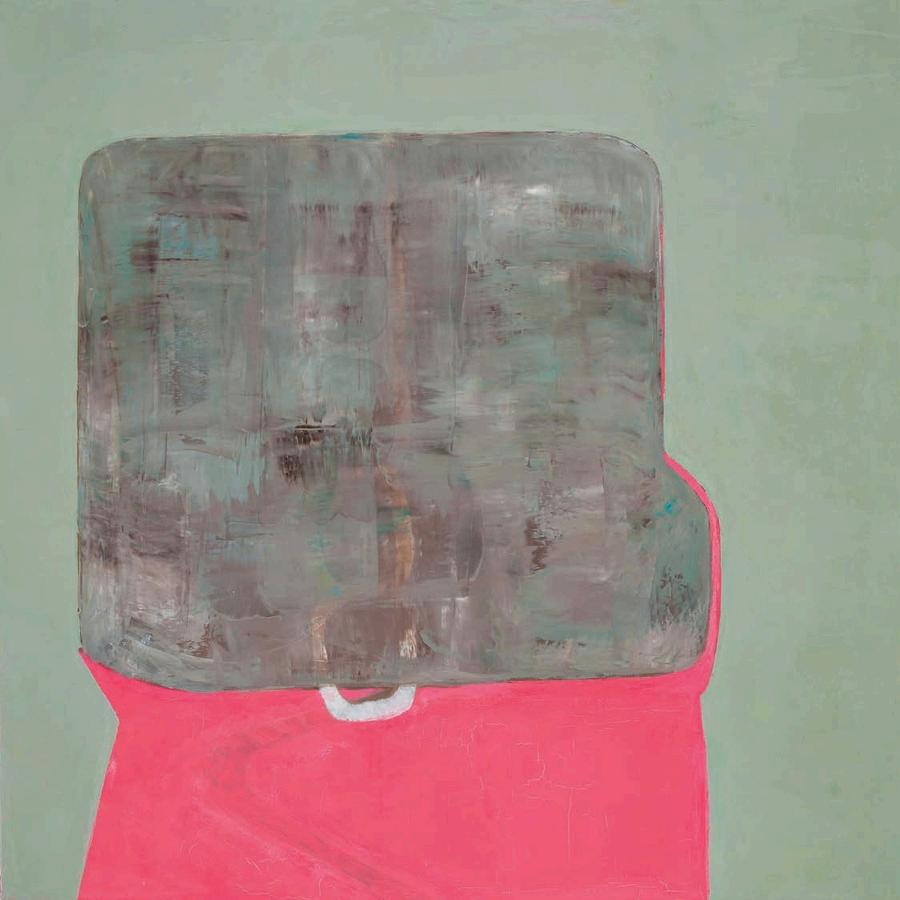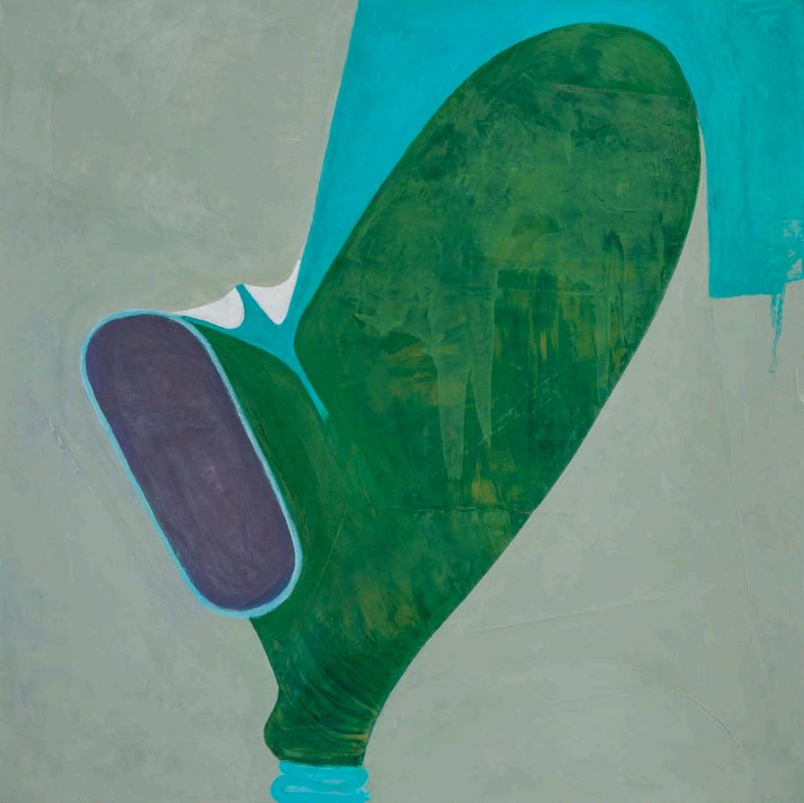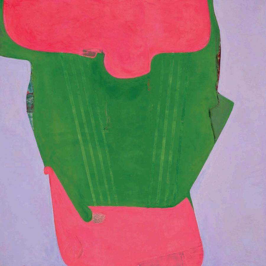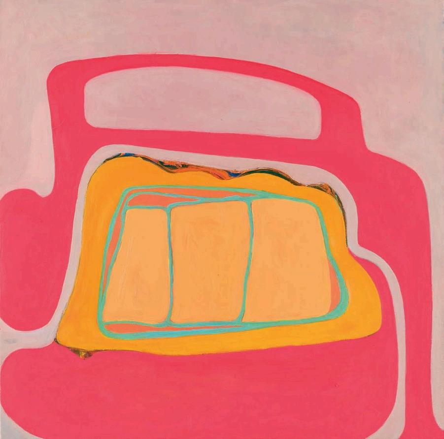 offset by a bright yellow drop shadow that cuts out the surrounding negat ve space. Forgetting the Self contains a d rty magenta biomorphic head-like form propped up by a phthalo blue grooved neck, framed by a white negative space It is strange mysterious and highly evocat ve A l three paint ngs emphasize their history Successive ayers of paint create muted passages, which at times, expose transparent underpaintings that act as visual breadcrumbs wa king the viewer through labor, time, and decision mak ng.