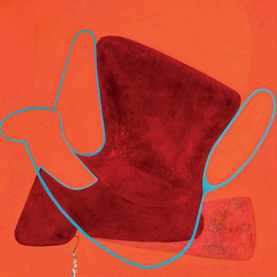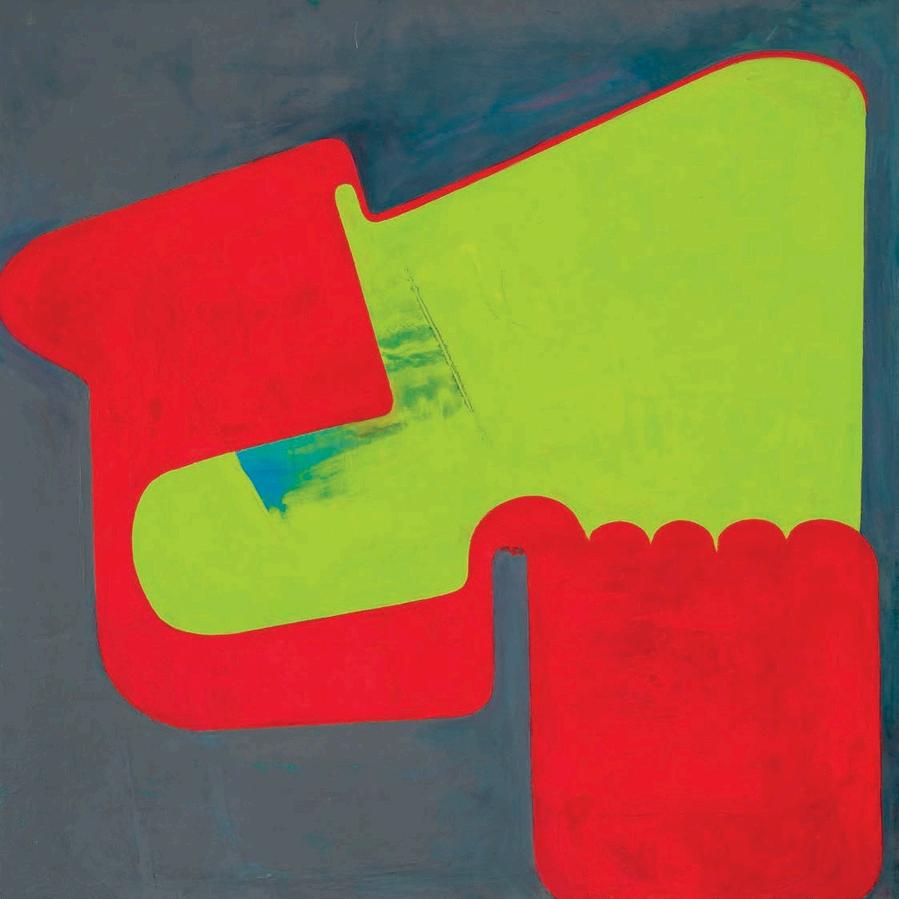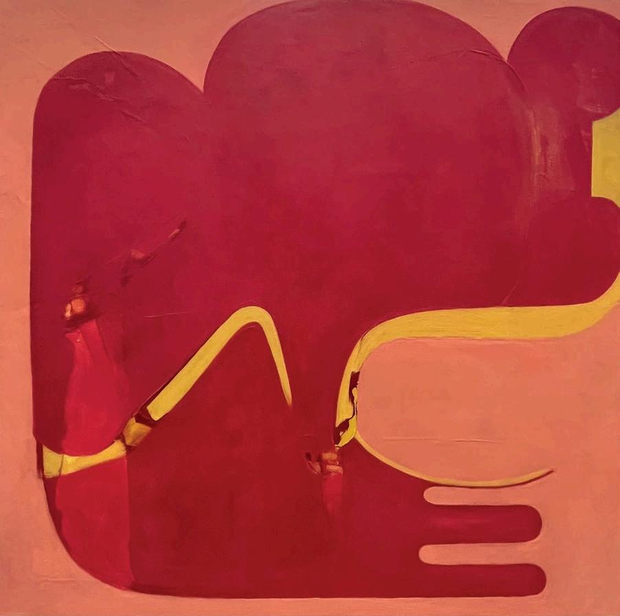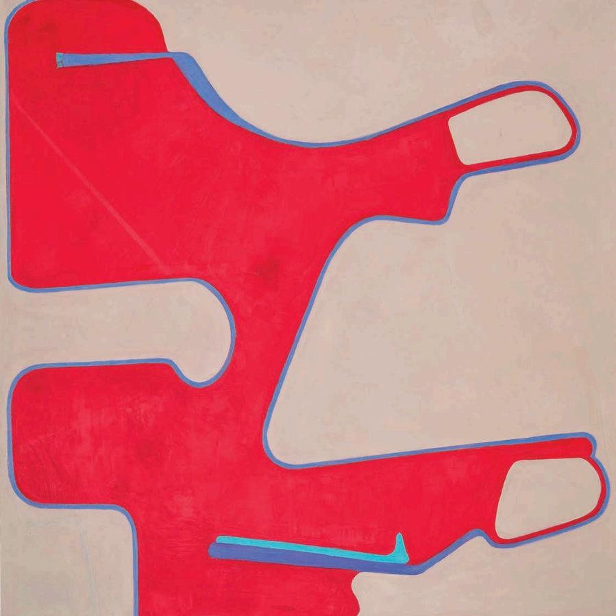 While I had been familiar w th Fran Shalom’s work n the past, a recent summer visit to her studio in Jersey City revealed a certain cont nu ty behind her improvisation. A number of recent 2024 paint ngs l ke Double Take, Dance Yourself Clean, and Forgett ng the Self a use variants of red, orange, magenta or pink as a dom nant color assigned to a central form on an off-square substrate. Here Shalom s co or is found, matte and expansive. There is a sharp dynamism to Double Take, which features a large red curvilinear central form with swirling appendages,