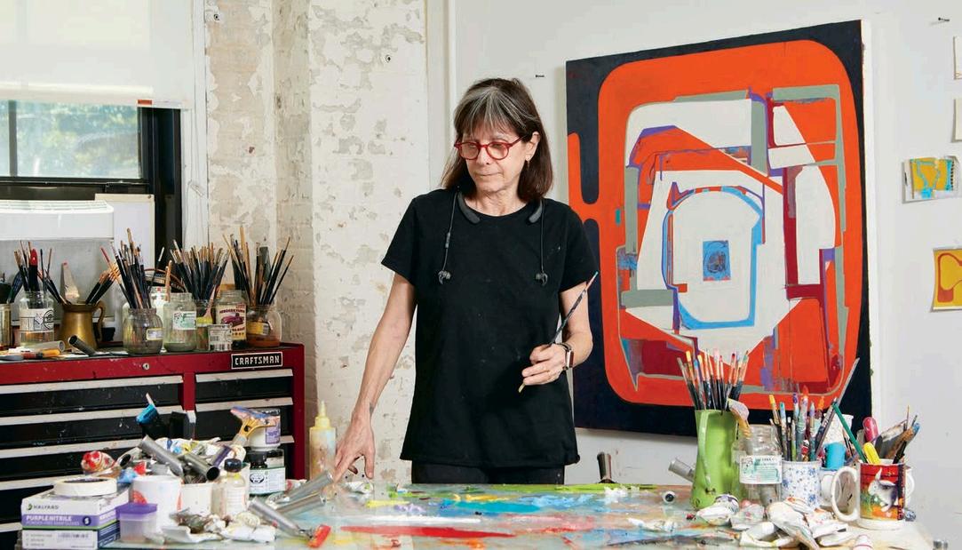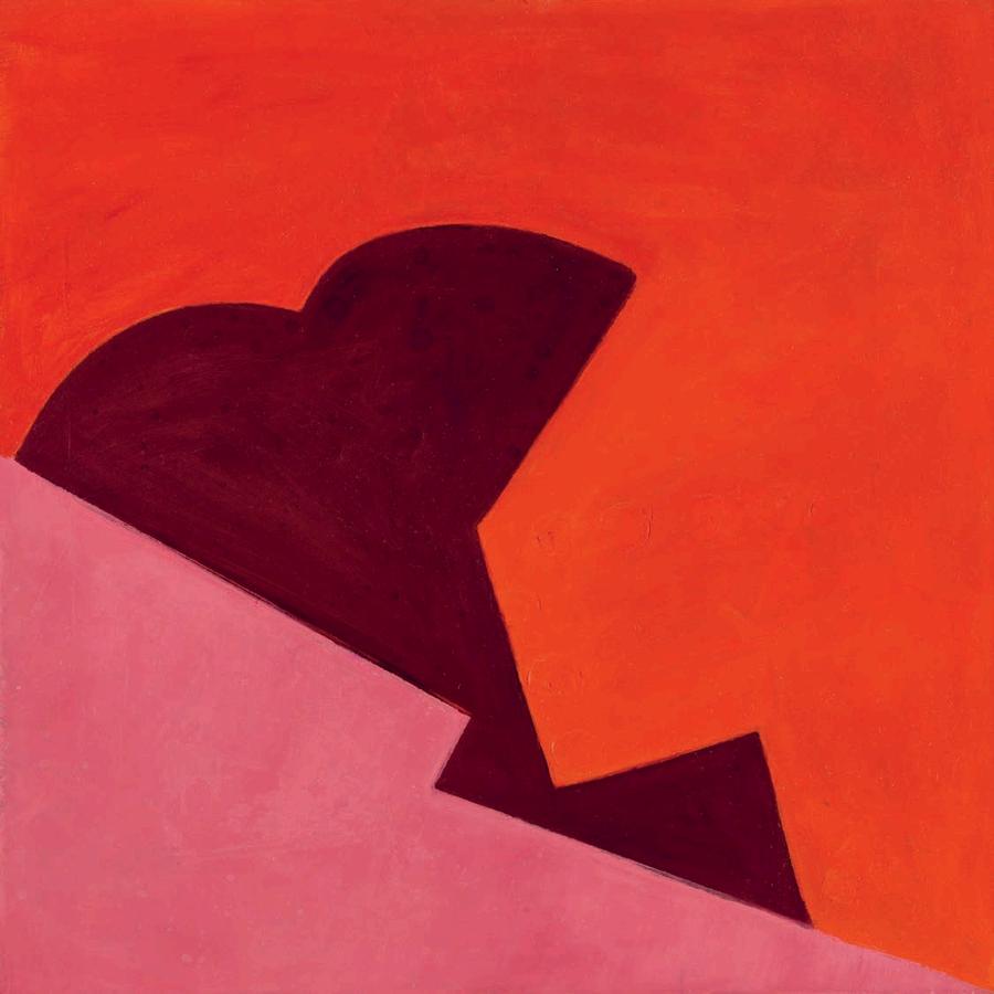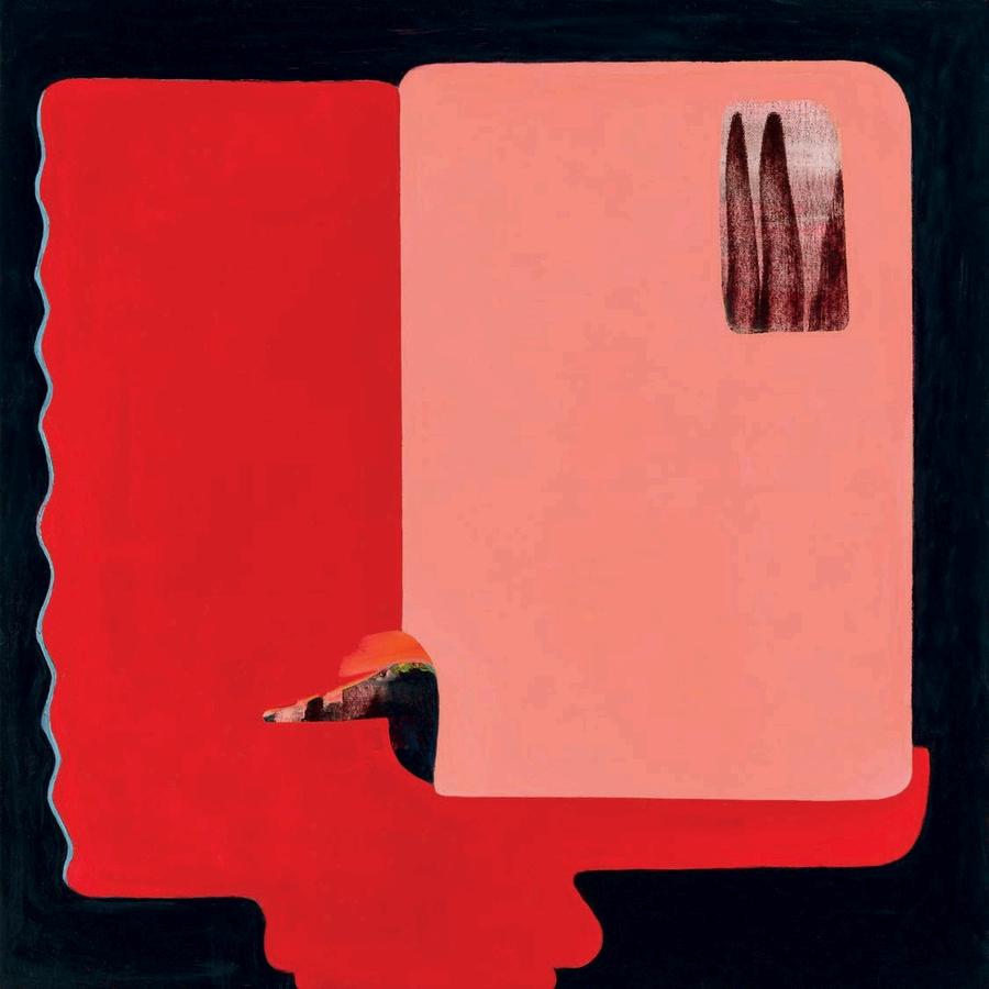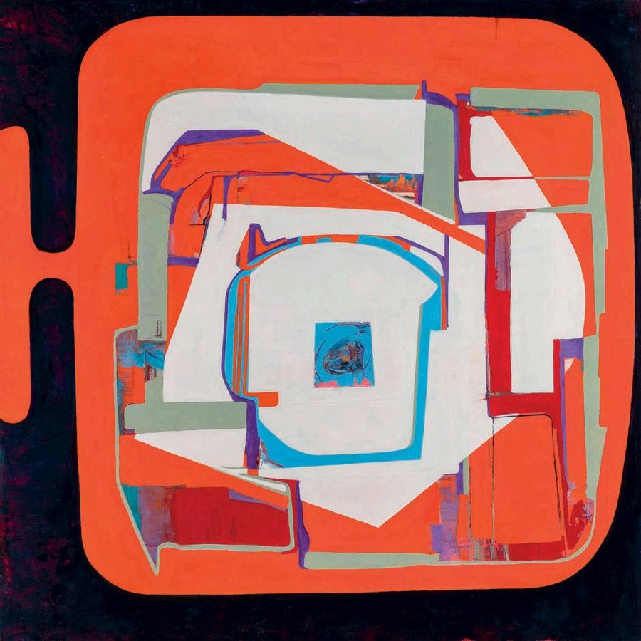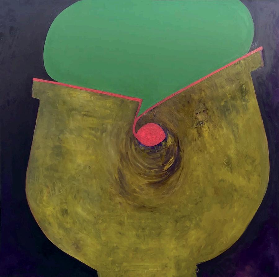 While I had been familiar w th Fran Shalom’s work n the past, a recent summer visit to her studio in Jersey City revealed a certain cont nu ty behind her improvisation. A number of recent 2024 paint ngs l ke Double Take, Dance Yourself Clean, and Forgett ng the Self a use variants of red, orange, magenta or pink as a dom nant color assigned to a central form on an off-square substrate. Here Shalom s co or is found, matte and expansive. There is a sharp dynamism to Double Take, which features a large red curvilinear central form with swirling appendages,