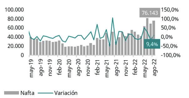 Importación de Nafta En miles de dólares FOB y variación mensual %.
