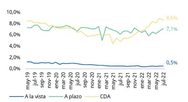El promedio ponderado de las tasas de interés pasivas en moneda local fue de 4,6% en julio del 2022. Se registraron mayores niveles en los promedios pon derados de los tres instrumentos, en términos interanuales. Sin embargo, en términos mensuales, la tasa de interés promedio de los CDA y depósitos a la vista disminuyeron en 0,4 y 0,1 puntos porcentuales (p.p.) respectivamente, mientras que la de los depósitos a plazo aumentó en 0,5 p.p.