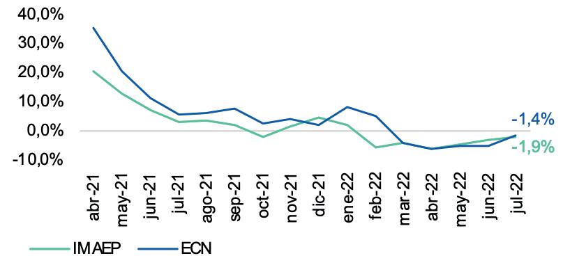 En julio del 2022, el Estimador de Ci fras de Negocios (ECN) registró una disminución interanual de 1,4% donde influyeron principalmente los malos desempeños en materiales de cons trucción y ventas de combustibles. Por otro lado, como resultado de las bajas en los sectores de agricultura, ganadería y construcción, principal mente, el Indicador Mensual de la Ac tividad Económica (IMAEP) evidenció una caída de 1,9%