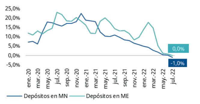 Al considerar la liquidez por moneda, se evidencia nuevamente que existe una mayor reducción en dólares (ME) que en guaraníes (MN). En julio del 2022, la liquidez en ME registró una variación interanual de -23,5%, mien tras que en MN esta fue de -5,8 %.