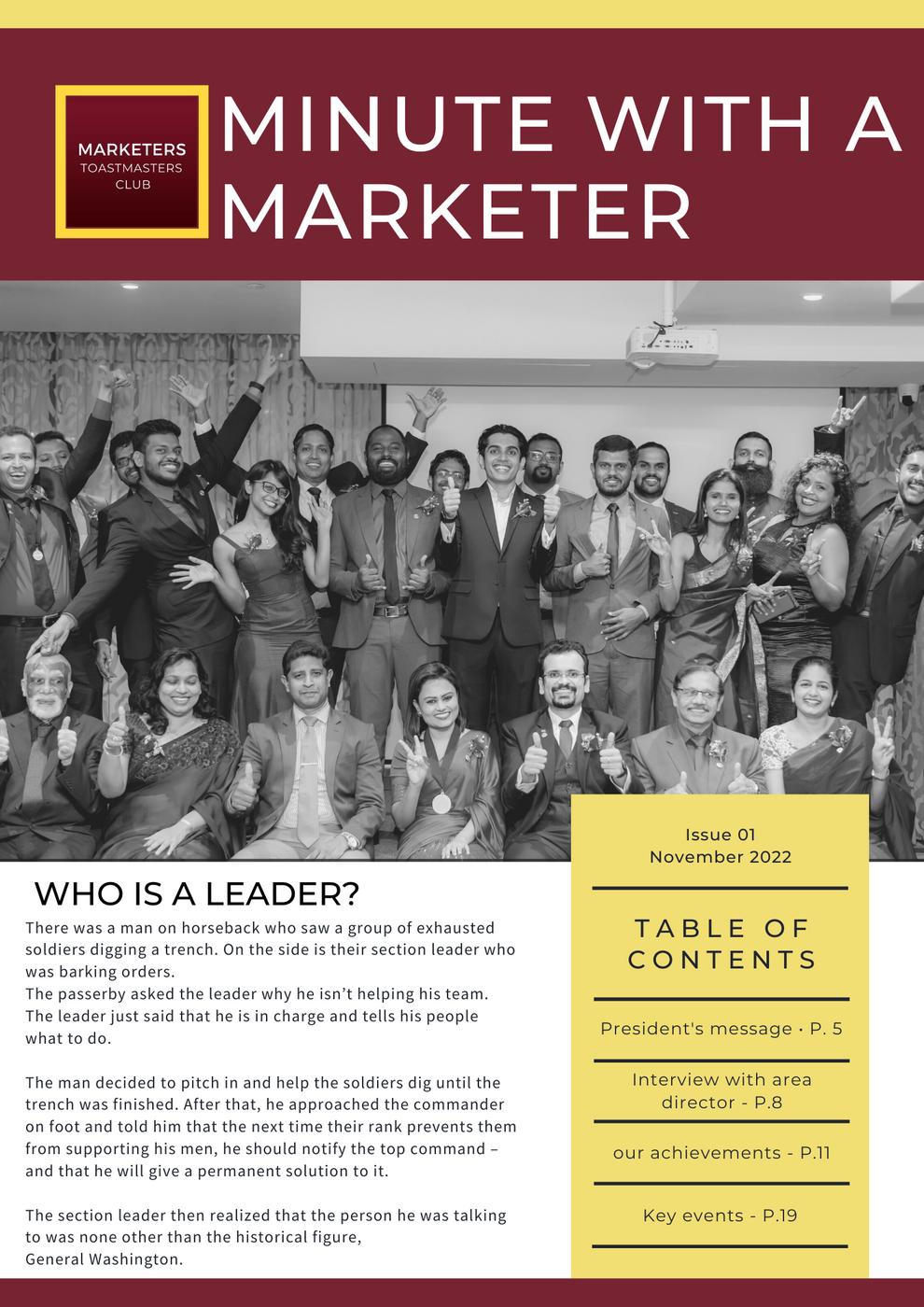 Iamimmenselydelightedandprivilegedtosharemy thoughtsasthe14thPresidentoftheestimableMarketers ToastmastersClubinitsNovembernewsletterissue'Minute withaMarketer’.Firstly,IwouldliketothankTMAbdul Hafeel,theVicePresidentofPublicRelationsforbringingup thenewsletterbacktotheclubasitwasnotdoneforthe pastfewyears.MyteamandItooktheofficeonthe1stof June2022,whentheclubwasinagreatfinancialposition alongwithtwentymemberswhowereactivelyparticipating intheclubactivitieswhichwereallthankstotheprevious substantialleadership.