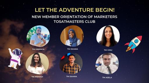 Thefirstorientationeventtoonboardthe newrecruitsofthenewtermforMarketers TMChappenedonthe9thofOctober.We hadsessionsconductedbyPresidentTM Yashodhara,VPEducationNisal,VP MembershipArthy,andTreasurerTM Franklin.Thesessionswereconductedon thezoomplatformbutalltheparticipants engagedthroughouttheevent.Wehad6 amazinglyenergeticnewtoastmasters thatjoinedourlittlefamily.