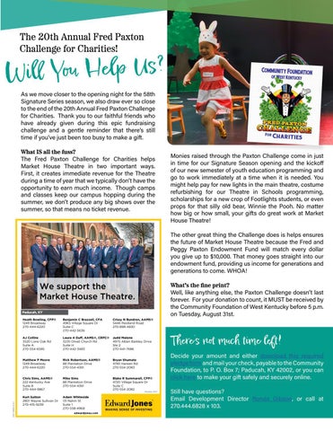 ? s U p l e H u o Y ill W As we move closer to the opening night for the 58th Signature Series season, we also draw ever so close to the end of the 20th Annual Fred Paxton Challenge for Charities. Thank you to our faithful friends who have already given during this epic fundraising challenge and a gentle reminder that there’s still time if you’ve just been too busy to make a gift.