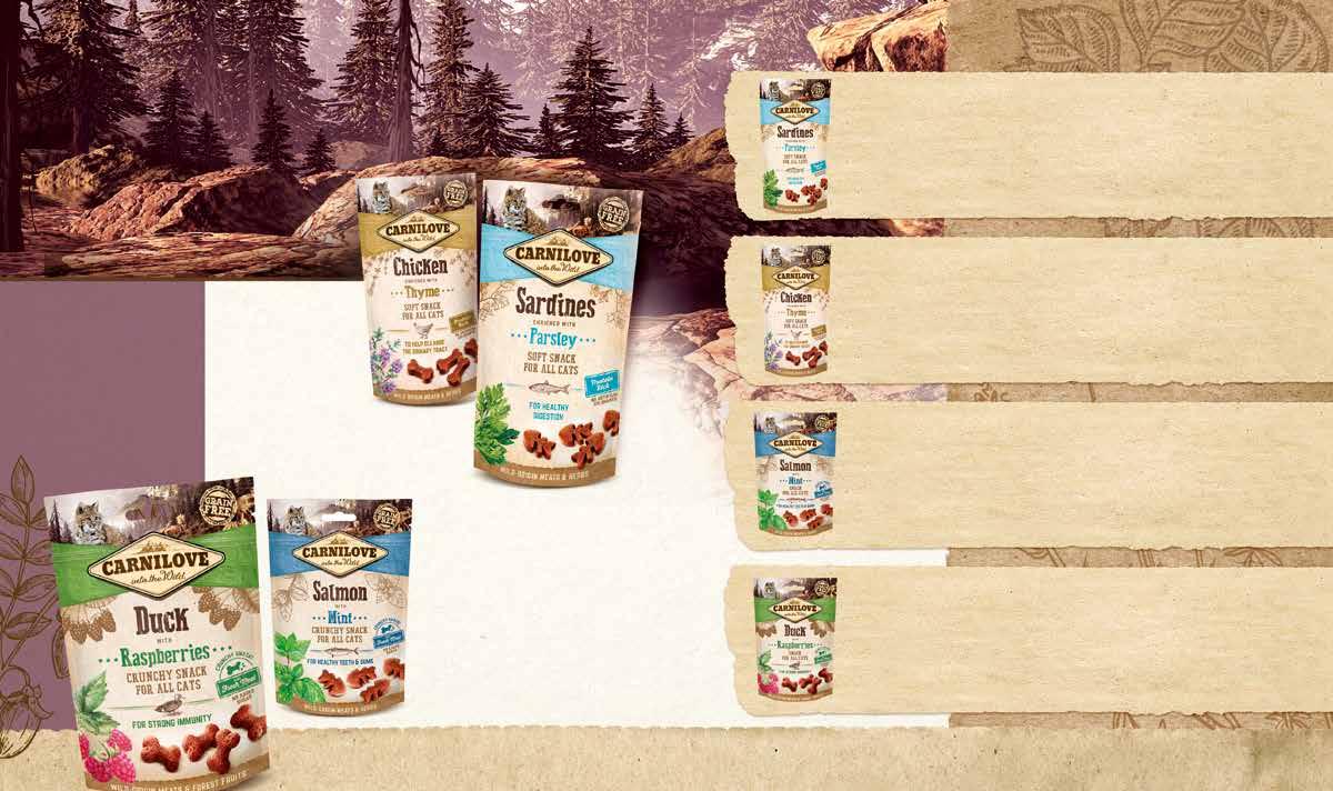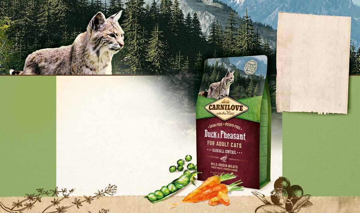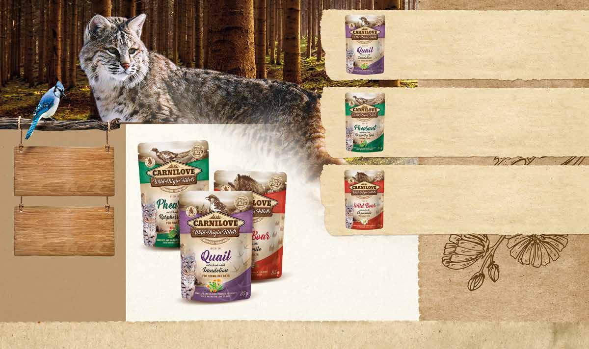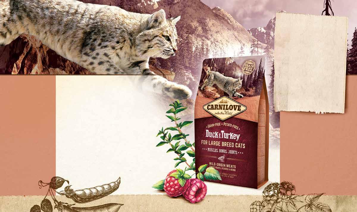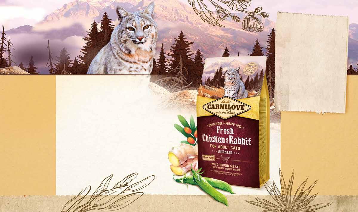 Η Carnilove έχει σχεδιαστεί με σεβασμό στις φυσικές διατροφικές συνήθειες της γάτας. Σύνθεση χωρίς δημητριακά ,πλούσια σε κρέας άγριας προέλευσης όπως σολομός,γαλοπούλα,πάπια,φασιανός, αρνί, τάρανδος και αγριόχοιρος καθώς και νέες συνθέσεις με φρέσκο κρέας κυπρίνου,πέστροφας,κουνελιού και κοτόπουλου σε συνδυασμό με φρούτα του δάσους και βότανα. Η Carnilove Cat παρέχει όλες τις απαραίτητες πρωτεΐνες, λίπη, βιταμίνες και φυσικά αντιοξειδωτικά που συμβάλλουν θετικά στην καλή φυσική καταστάση του οργανισμού και στην ενίσχυση του ανοσοποιητικού συστήματος. Carnilove "Η γάτα ήταν και θα είναι πάντα μία ανεξάρτητη οντότητα η οποία γνωρίζει πραγματικά πώς να εκτιμάει την ανθρώπινη φροντίδα. Με σεβασμό στο αρχέγονο ένστικτο για κρέας και τον απαιτητικό χαρακτήρα της γάτας, αναζητούμε τα καλύτερα συστατικά της φύσης με σκοπό την υγεία και την ευεξία."