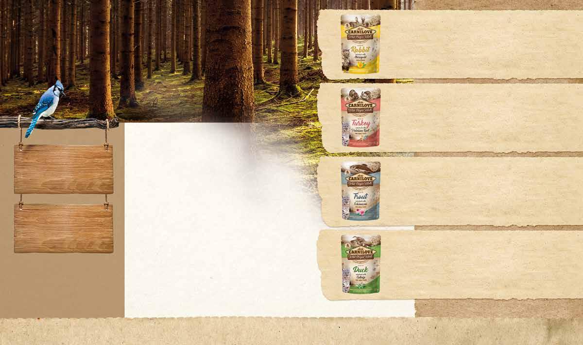 κατάστασης και τη διασφάλιση της υγείας του πεπτικού συστήματος. Τα ωμέγα-3 λιπαρά οξέα υποστηρίζουν το υγιές δέρμα, την καρδιά και τις αρθρώσεις. Η εχινάκεια ενισχύει την ειδική και μη ειδική άμυνα του οργανισμού και έχει αντιφλεγμονώδη, αντιβακτηριδιακή και αντιική δράση. Υποστηρίζει το υγιές δέρμα, την εύρυθμη λειτουργία του πεπτικού συστήματος και κατ' επέκταση την υγεία του οργανισμού γενικότερα. Φακελάκι με κομμάτια άγριου κρέατος σε φιλέτο. Πλήρης τροφή ή συμπληρωματική τροφή για τις κροκέτες. Μοναδικοί τύποι κρέατος. Χωρίς δημητριακά, χωρίς πατάτα, χωρίς GMO, χωρίς σόγια, χωρίς ζάχαρη, χωρίς συντηρητικά ή χρωστικές. Υψηλή περιεκτικότητα σε κρέας έως 85%. Το υποαλλεργικό και υψηλής πεπτικότητας κρέας πάπιας προάγει τη βέλτιστη φυσική κατάσταση του σώματος και δεν επιβαρύνει την πέψη. Η υψηλή περιεκτικότητα πολυακόρεστων λιπαρών οξέων προστατεύει την καρδιά και το κυκλοφορικό σύστημα. Φακελάκι με κομμάτια άγριου κρέατος σε φιλέτο. Πλήρης τροφή ή συμπληρωματική τροφή για τις κροκέτες. Μοναδικοί τύποι κρέατος. Χωρίς δημητριακά, χωρίς πατάτα, χωρίς GMO, χωρίς σόγια, χωρίς ζάχαρη, χωρίς συντηρητικά ή χρωστικές. Υψηλή περιεκτικότητα σε κρέας έως 85%. Διατροφή υψηλής πεπτικότητας με κρέας από κουνέλι για την υποστήριξη ενός υγιούς πεπτικού συστήματος. Πολύ χαμηλή περιεκτικότητα σε λίπος για την ενίσχυση της βέλτιστης φυσικής κατάστασης. Η καλέντουλα έχει αντιφλεγμονώδη δράση και ευεργετικές ιδιότητες για το δέρμα, το τρίχωμα, τις αρθρώσεις και την καρδιά. Προάγει την υγεία των αρθρώσεων και καταστέλλει τις αλλεργικές αντιδράσεις. Διαθέσιμες συσκευασίες: 85 g Τα φακελάκια της Carnilove βασίζονται σε μία φυσική διατροφή που περιέχει κρέας, βότανα και φρούτα του δάσους προσφέροντας στα κατοικίδιά σας μία ακαταμάχητη γεύση με φυσικά χαρακτηριστικά. O in Pieces in Paté No! preservatives & colorants 85% WILD-ORIGIN MEATS GRAIN POTATO GMO SOY No! { & ORGANS PIECES IN PATÉ 85 G IN GRAVY SUGAR-FREE