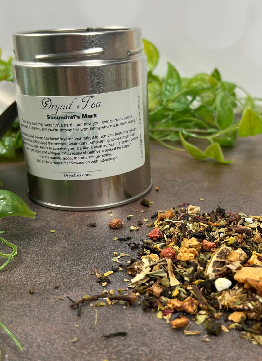 Sure, they said they were just a bard— but now your coin purse is lighter, your heart is heavier, and you’re sipping tea, wondering where it all went wrong. Scoundrel’s Mark is a bold black and oolong tea blend layered with bright lemon and brooding spices - a contrast as captivating as the one who makes the mark. Zesty citrus notes tease the senses, while dark, smoldering spices linger beneath the surface, ready to surprise you. It’s like a wink across the tavern before they get close and whisper, “You really should’ve checked for traps.” For the chaotic good, the charmingly shifty, and anyone who rolls Persuasion with advantage.