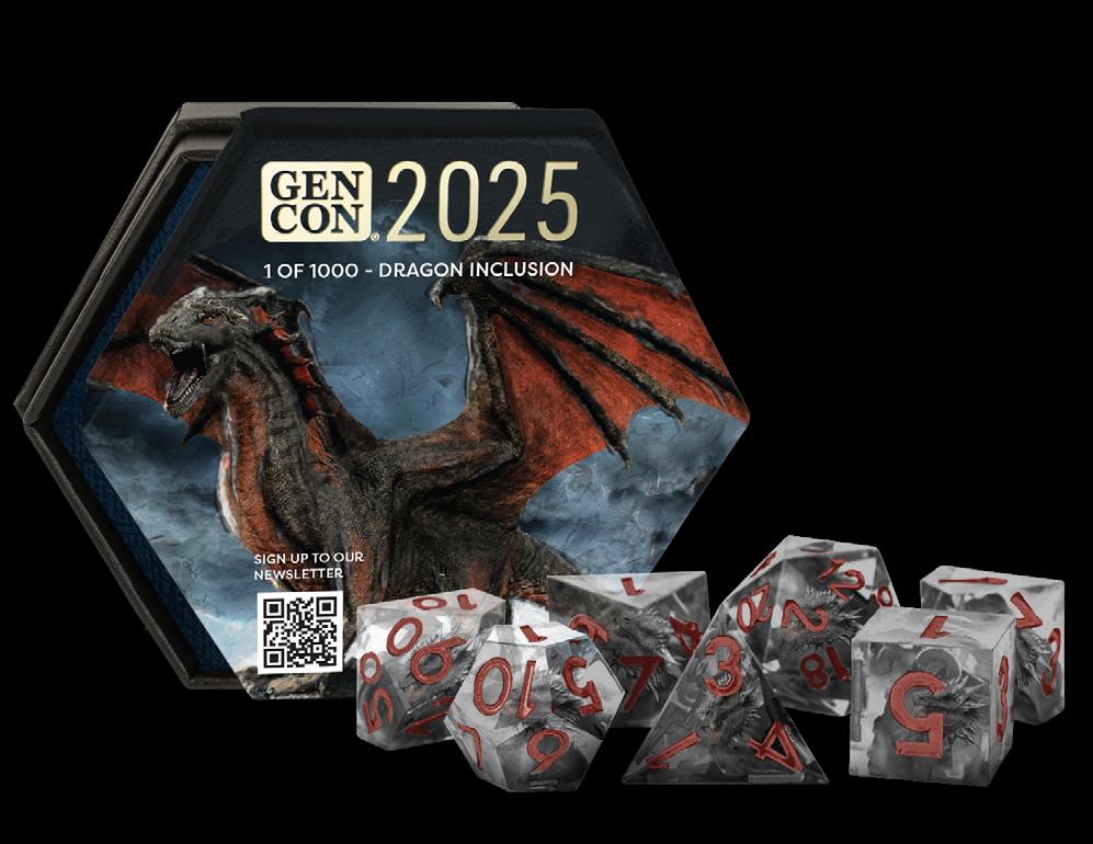 Celebrate Gen Con with two matching inclusion dice sets from Gate Keeper Games! The first is Genevieve-red with real metal dragon scales inside, resting upon her loot hoard. The second is Wyrmling-purple with Genevieve’s unhatched dragon eggs inside, warming upon a bed of golden loot. Officially licensed and designed exclusively for Gen Con 2025.