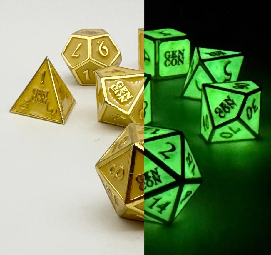 Roll into adventure with officially licensed Gen Con metal dice. These premium metal dice don’t just deliver satisfying weight for your tabletop game; this year, they glow in the dark to keep the magic alive when the lights go down! Each set comes in a protective tin case. Whether you’re navigating dungeon crawls or epic campaigns, these luminous dice ensure your rolls shine as bright as your victories.