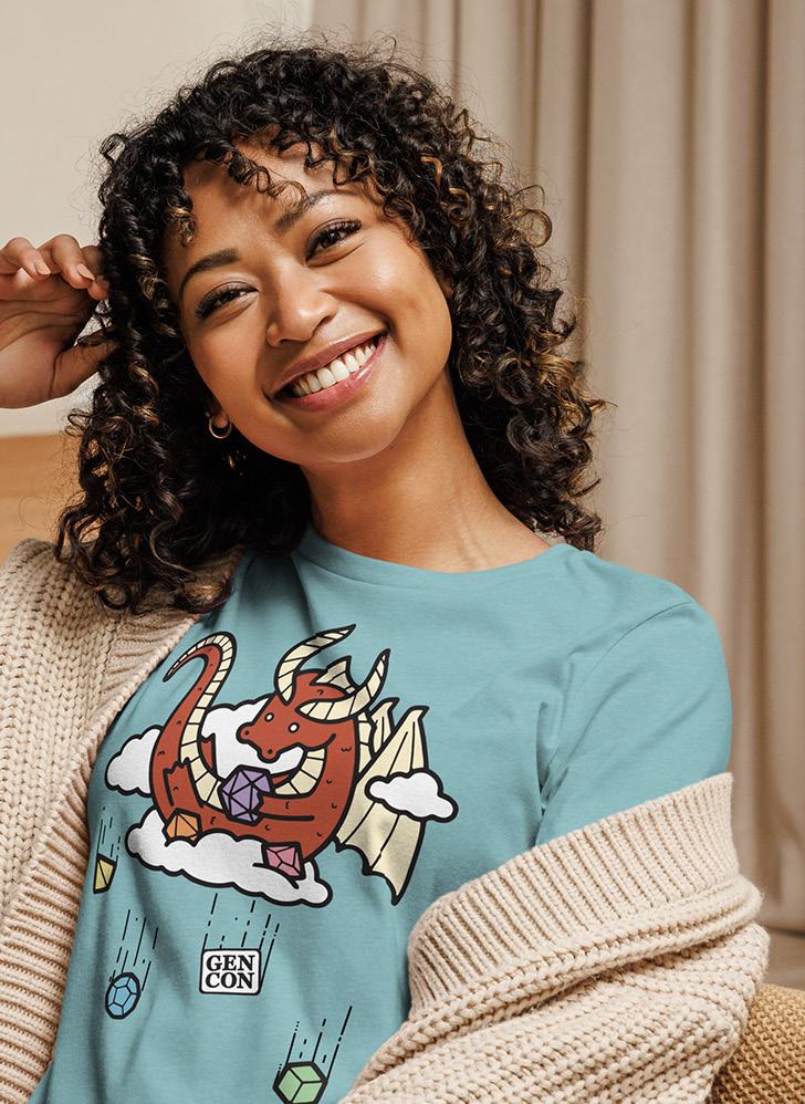 Perched atop a cute little cloud, she’s throwing all the rolls. We don’t know what she’s rolling for, but she sure looks cute doing it. Embrace your inner wanderer and wear the Gen Con Skyrolling Genevieve T-Shirt .