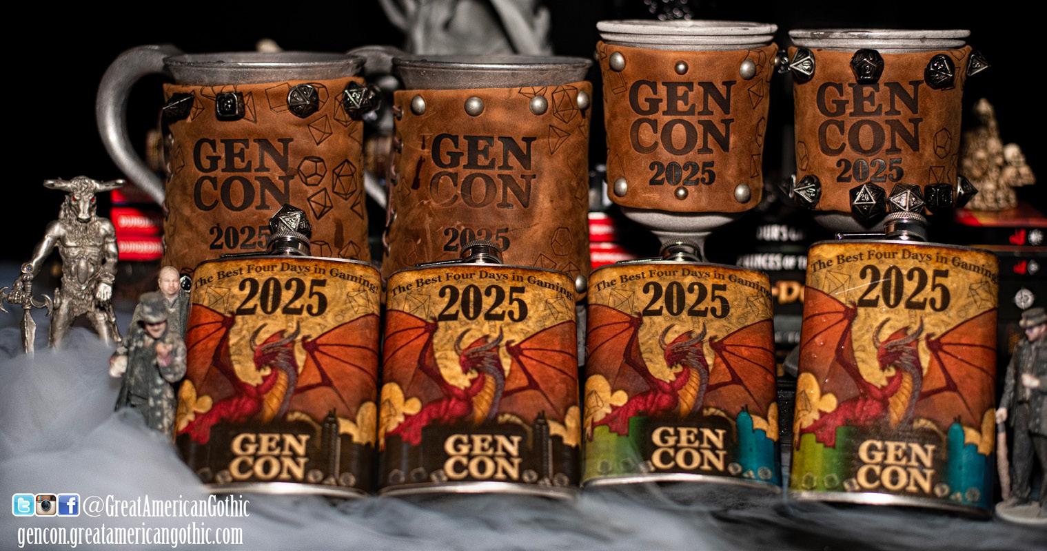 Have a drink with us! Get your officially licensed Gen Con 2025 flask featuring Genevieve soaring wide over Indianapolis’s black or rainbow skyline, available with or without dice topper; or your statesmetal tankard or goblet, available with or without dice wrap.