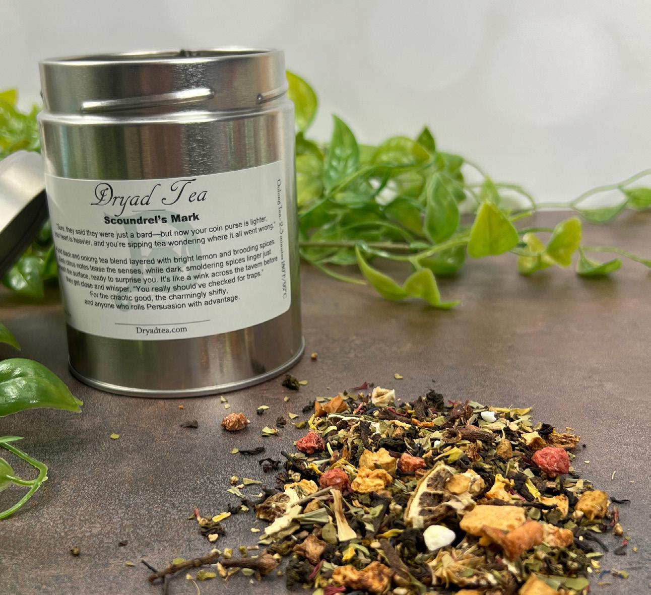 Sure, they said they were just a bard—but now your coin purse is lighter, your heart is heavier, and you’re sipping tea, wondering where it all went wrong. Scoundrel’s Mark is a bold black and oolong tea blend layered with bright lemon and brooding spices - a contrast as captivating as the one who makes the mark. Zesty citrus notes tease the senses, while dark, smoldering spices linger beneath the surface, ready to surprise you. It’s like a wink across the tavern before they get close and whisper, “You really should’ve checked for traps.” For the chaotic good, the charmingly shifty, and anyone who rolls Persuasion with advantage.