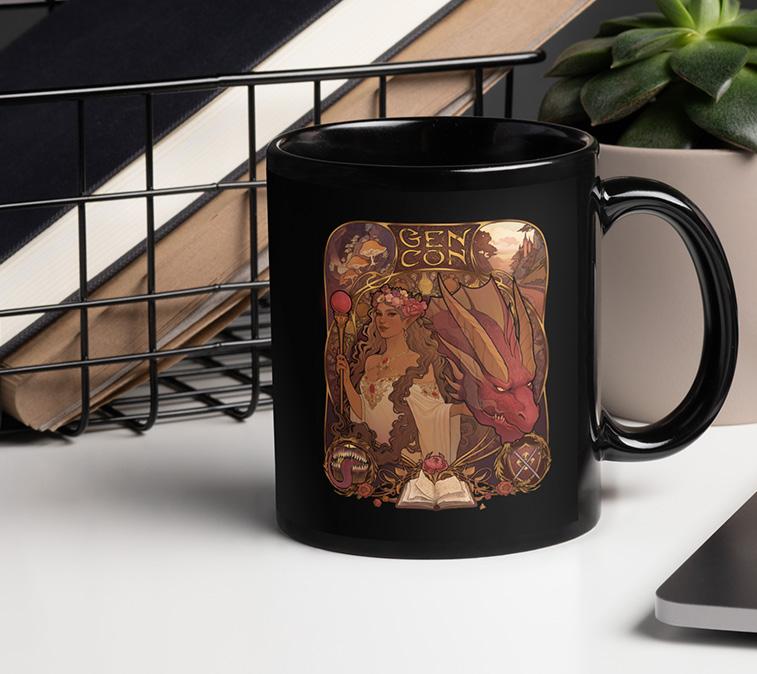 Featuring original artwork by the legendary Megan Lara, this 11 oz black mug showcases the stunning Gen Con 2025 Program Book illustration— complete with a radiant heroine, Genevieve, and enchanted forest vibes. Whether you’re fueling up for a dungeon crawl or just surviving your morning meeting, this mug adds a little magic to every moment.