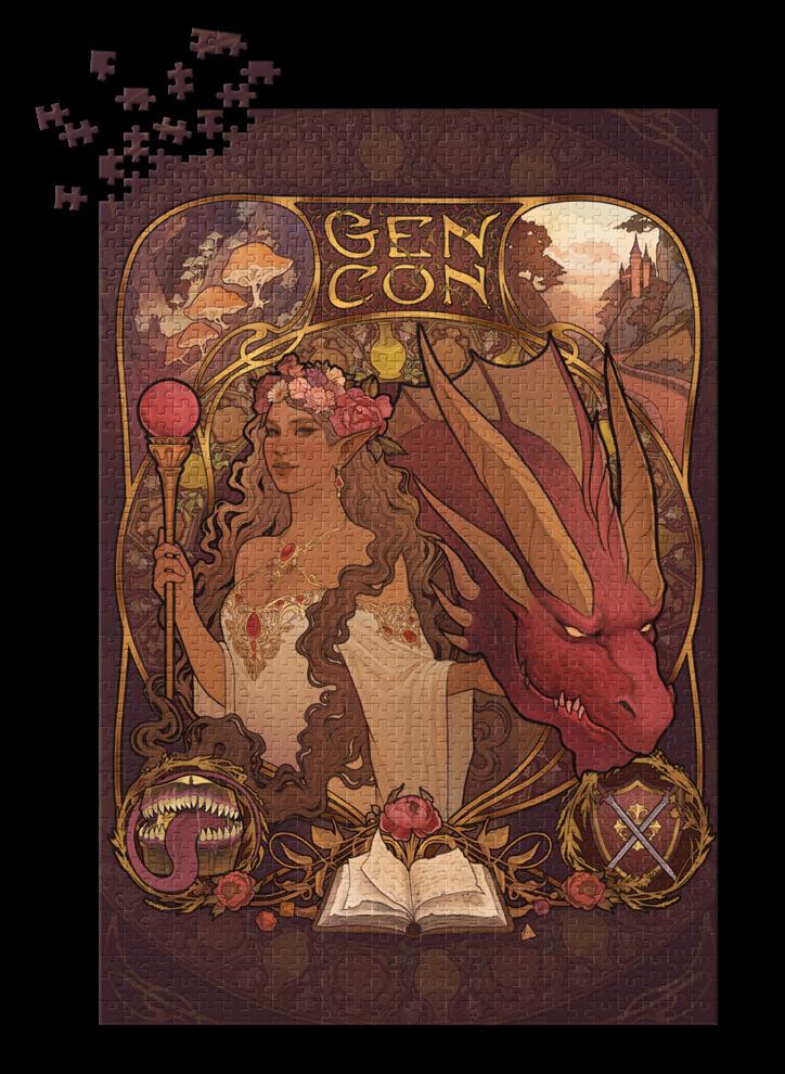 The Gen Con 2025 Program Book art has been transformed into a beautiful puzzle! Featuring original artwork by the legendary Megan Lara, the Gen Con 2025 Program Book Puzzle brings this fantasy scene to life in 1,000 beautifully illustrated pieces. From the radiant heroine to her firebreathing companion, Genevieve, and the enchanted forest beyond, every detail is a tribute to epic quests and tabletop dreams.