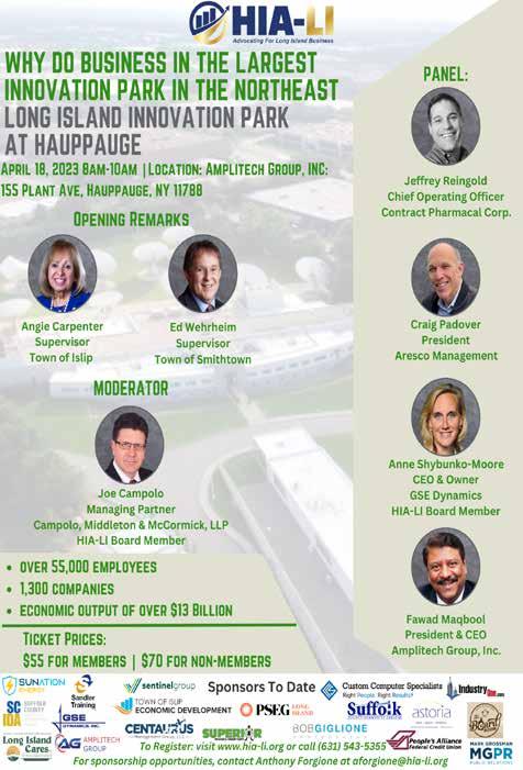 LABEL HIA-LI LETTER FROM THE PRESIDENT: PG 5 A letter from the HIA-LI President & CEO, Terri Alessi-Miceli HIA-LI’S HEARD AROUND THE ISLAND: PG 38-39 News, Updates, Events, and Promotions from our member companies! HIA-LI’S INDUSTRY LIST: PGS 34-35 Manufacturing & Distribution Companies VOLUME 42 • ISSUE 3 • MARCH 2023 DOING BUSINESS IN THE LONG ISLAND INNOVATION PARK SPECIAL SECTION: ECONOMIC DEVELOPMENT IN THE TOWN OF ISLIP PROGRAM | P. 20-21