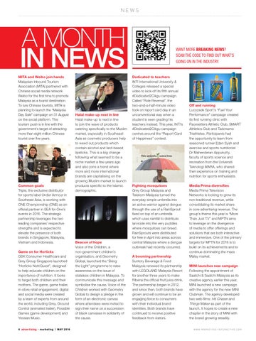 Off and running Lucozade Sport’s “Fuel Your Performance” campaign created its first running clinic with Pacesetters Athletic Club, SMART Athletics Club and Tadonamo Triathletes. Participants had the opportunity to learn from seasoned runner Edan Syah and exercise and sports nutritionist Dr Mahenderan Appukutty, faculty of sports science and recreation from the Universiti Teknologi MARA, who shared their experience on training and nutrition for sports enthusiasts. Media Prima diversifies Media Prima Television Networks is looking to grow its non-traditional revenue, while consolidating its market share in core advertising revenue. The group’s theme this year is “More Than Just TV” and MPTN aims to leverage on the divergence of media to offer offerings and solutions that are both interactive and immersive. One of the primary targets for MPTN for 2016 is to build on its achievements and to continue dominating the mass Malay market. MINI launches new campaign Following the appointment of Saatchi & Saatchi Malaysia as its creative agency earlier this year, MINI launched a new campaign with the agency for the new MINI Clubman. The agency developed two web films: Hit Chaser and Things Maker as part of the launch. It hopes to create a new chapter in the story of MINI with the brand growing steadily. WWW. MARK E TING-IN TE RAC TI VE . C OM