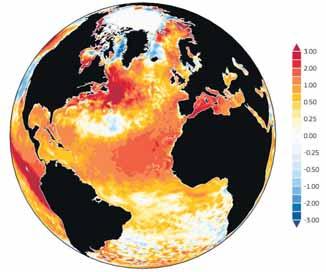 Por ejemplo, hay regiones como el Atlántico Norte o el Mediterráneo que están muy por encima de ese valor y otras regiones que están muy por debajo. En el Atlántico Norte hay regiones que muestran un calentamiento muy fuerte, por ejemplo, en la zona al sur de Groenlandia o en el este de Canadá hay lugares que tienen un calentamiento que incluso supera los 3°C. El Mediterráneo