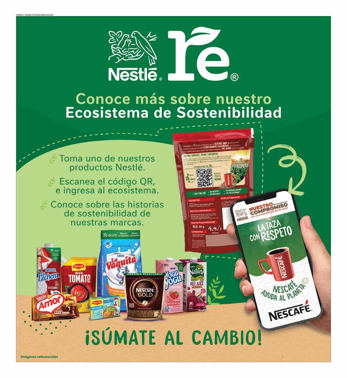 • Un tercer hito es el lan zamiento del Ecosistema de Sostenibilidad, el cual tiene como objetivo informar a los stakeholders sobre el trabajo de cada una de las marcas de Nestlé. Para acceder al ecosis tema de sostenibilidad, los consumidores deberán in gresar a los códigos QR en la parte posterior de los produc tos o ingresando al portal: https://www.nestlesostenible. com.ec.