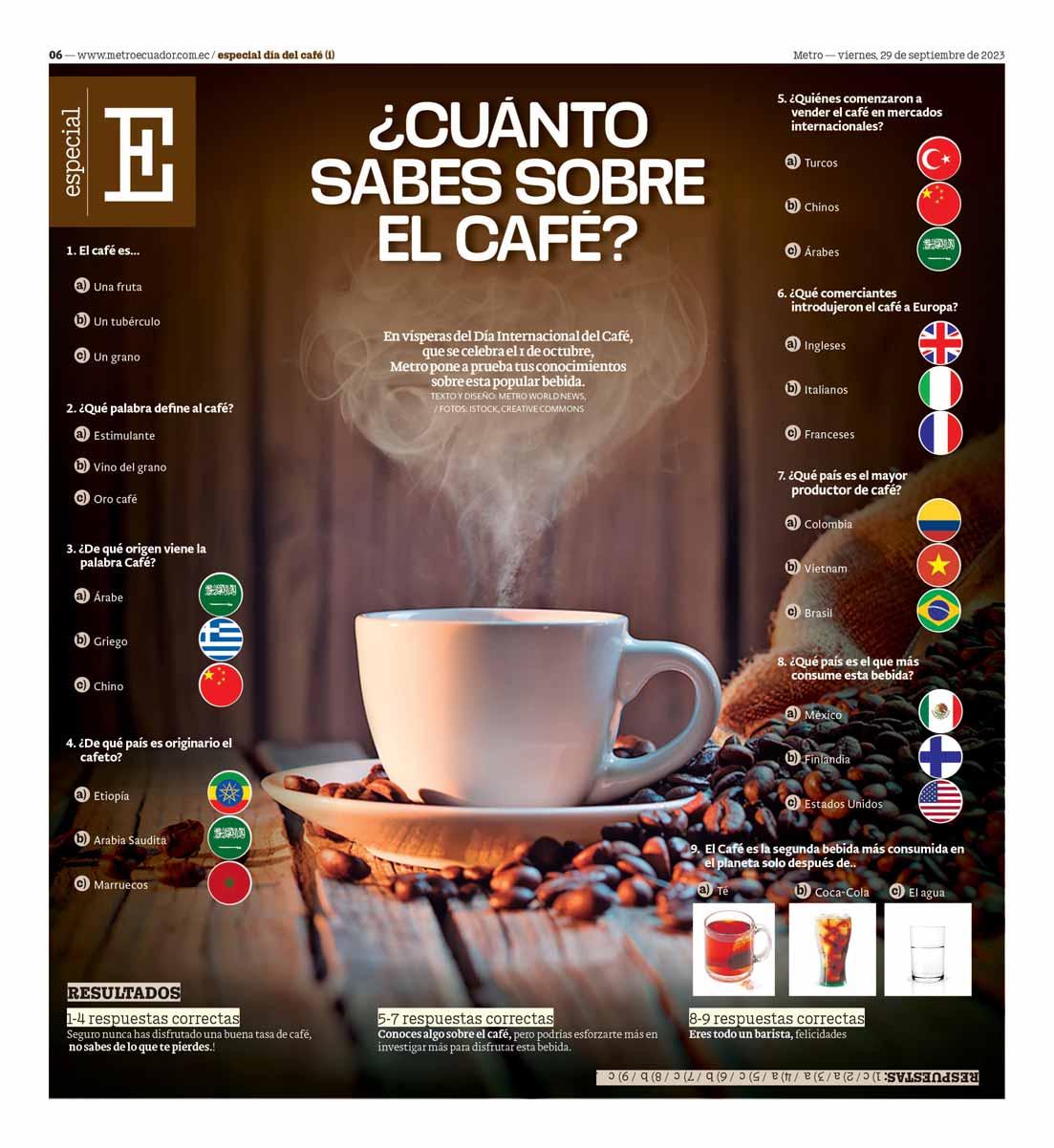 A vísperas del Día Mundial del Café, le mencionamos todas sus bondades y le retamos a que se demuestre cuánto conoce sobre esta bebida tan popular. Págs. 06-08
