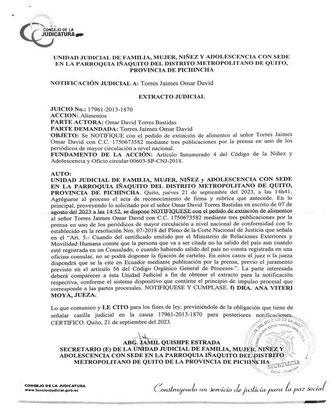 UNIDAD JUDICIAL CIVIL CON SEDE EN LA PARROQUIA IÑAQUITO DEL DISTRITO METROPOLITANO DE QUITO, PROVINCIA DE PICHINCHA. Quito, miércoles 8 de marzo del 2023, a las 10h33. VISTOS: Agréguese al proceso el escrito y anexo que anteceden.- Atento al momento de la causa, se dispone: PRIMERO.- De conformidad con el Art. 148 del Código Orgánico General de Procesos se procede a calificar la reforma a la demanda presentada por los señores ABELARDO TONATO CALLATASIG, MARIA LUISA CHICAIZA TENORIO, de clara, precisa y por contener los requisitos previstos en los artículos 142 y 143 del Código Orgánico General de Procesos, al amparo de lo determinado en el artículo 169 de la Constitución de la República del Ecuador, se ADMITE a Procedimiento Ordinario establecido en el Libro IV, Título I, Capítulo del Código Orgánico General de Procesos, y en virtud a lo prescrito en el artículo 289 ibídem. SEGUNDO.- Conforme lo ordenado en el inciso séptimo del artículo 146 del COGEP, se dispone que se inscriba la presente reforma de demanda en el Registro de la Propiedad, para lo cual notifíquese mediante oficio al señor Registrador de la Propiedad del Distrito Metropolitano de Quito. TERCERO.- Conforme lo establecido en el segundo inciso del artículo 291 del COGEP se concede a las demandadas, EL TÉRMINO DE 30 DÍAS, contados a partir de la citación, a fin de que contesten la reforma a la demanda en la forma determinada en los artículos 151, 152 y siguientes del COGEP, salvo aplicación de la disposición contemplada en el artículo 157 ibídem, de ser el caso, para lo cual, cítese con el contenido de la reforma a la demanda y el presente auto a los demandados MARIA LEONOR BAZAN PACAS y MARIA JULIA BAZAN PACAS, en el lugar señalado en la demanda y de conformidad con los Arts. 54 y 55 del COGEP; para el efecto, envíese suficiente despacho a la oficina de citaciones; para lo cual, los actores presten las facilidades respectivas, a fin de citar a las demandadas.- Atento al juramento rendido por los actores ABELARDO TONATO CALLATASIG, MARIA LUISA CHICAIZA TENORIO, de conformidad con lo dispuesto en los Arts. 56 y 58 del Código Orgánico General de Procesos, cítese a los HEREDEROS PRESUNTOS Y DESCONOCIDOS DE LOS CAUSANTES JOSE MANUEL BAZAN TOAZA, ROSA ELENA PACAS MALES y OLGA MARIA BAZAN PACAS, en uno de los periódicos de amplia circulación que se editen en esta ciudad de Quito, mediante tres fechas distintas, la publicación contendrá un extracto de la demanda y providencia respectiva. Con fundamento en el Art. 5 del Código Orgánico General de Procesos en concordancia con el Art. 19 del Código Orgánico de la Función Judicial, en virtud de que el impulso procesal corresponde a las partes procesales conforme el sistema dispositivo, bajo prevenciones legales, se requiere a la parte actora proporcione en un término no mayor a cinco días las fotocopias necesarias para la elaboración de las boletas de citación correspondientes. CUARTO.- De conformidad con lo ordenado en la Disposición General Décima del Código Orgánico de Organización Territorial, COOTAD, con el contenido de la reforma a la demanda y este auto, CÍTESE a los personeros del Ilustre Municipio del Distrito Metropolitano de Quito. QUINTO.ANUNCIO DE PRUEBA: Considérese el anuncio de los medios probatorios señalados, para lo cual se estará a lo previsto en los artículos 160 y 294.7 literal d) del COGEP, sobre la admisibilidad y práctica de prueba que se realice en la respectiva audiencia. SEXTO: Téngase en cuenta la comparecencia del Magister Diana Carolina Pantoja Freire en su calidad de Subprocuradora del Distrito Metropolitano de Quito conforme lo justifica con la documentación habilitante que adjunta al escrito de fecha 02 de marzo del 2022, lo que se comunica para los fines de ley. Por falta de insumos por parte del Consejo de la Judicatura, este auto únicamente se notifica a los correos electrónicos o casilleros electrónicos consignados por las partes procesales, de conformidad a lo dispuesto en el artículo 66 del Código Orgánico General de Procesos –COGEP. Adicionalmente se recuerda a las partes que a partir del 11 de mayo del 2020, con la resolución 045-2020 emitida por el Pleno del Consejo entró en vigencia el acceso al módulo externo por medio de la Oficina de Gestión Judicial Electrónica a través de la página web del Consejo de la Judicatura, por medio del cual los defensores técnicos de las partes pueden ingresar con sus credenciales, a fin de verificar el contenido de los escritos digitalizados, para su conocimiento. Al amparo del artículo 14 de la Ley de Comercio Electrónico, Firmas Electrónicas y Mensajes de Datos, se indica que la firma electrónica contenida en el presente auto, tiene igual validez y genera los mismos efectos jurídicos que la firma manuscrita; en consecuencia, no será necesario consignar la firma manuscrita en la presente actuación judicial. Notifíquese. NOTIFÍQUESE Y CÚMPLASE. F. ALBAN SOLANO DIANA JAZMIN JUEZA Lo que pongo en su conocimiento, a fin de que señale casillero judicial en la ciudad de Quito y/o casilla electrónica para posteriores notificaciones.
