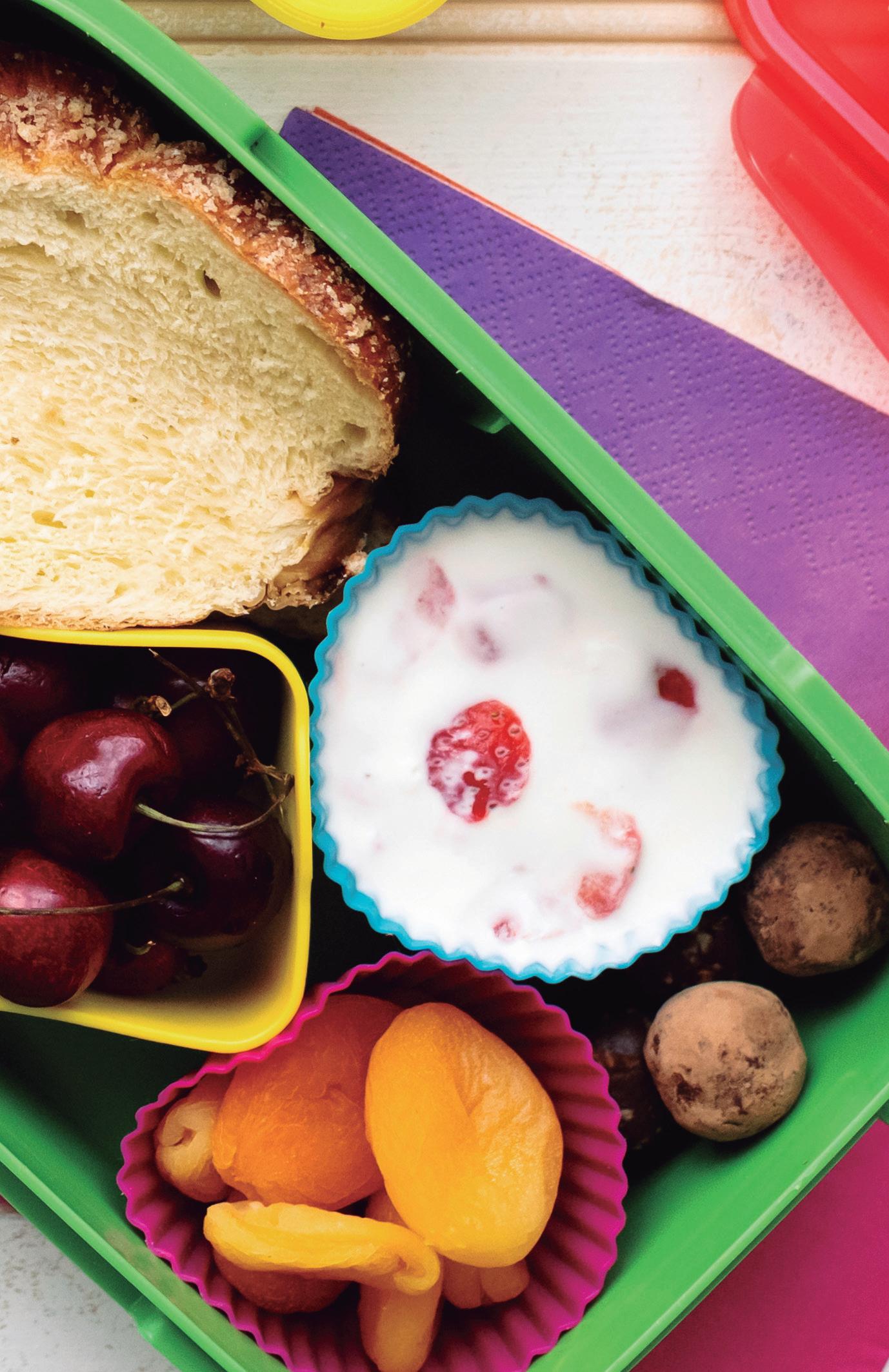 Primero, corta las frutas en trocitos. Luego, en un colorido bowl, pon unas cucharadas de yogurt natural o griego con trozos de cerezas, uvas, fresas, mandarinas y plátano. Puedes añadir cereales sin azúcar. Alrededor del bowl, deja algunos trozos de fruta; la idea es que tu pequeño también sumerja las frutas en el yogurt. Finalmente, haz fguras en las rodajas de pan, y si quieres consentirlo, decora con trocitos de chocolate. ¡Amará su lunch!