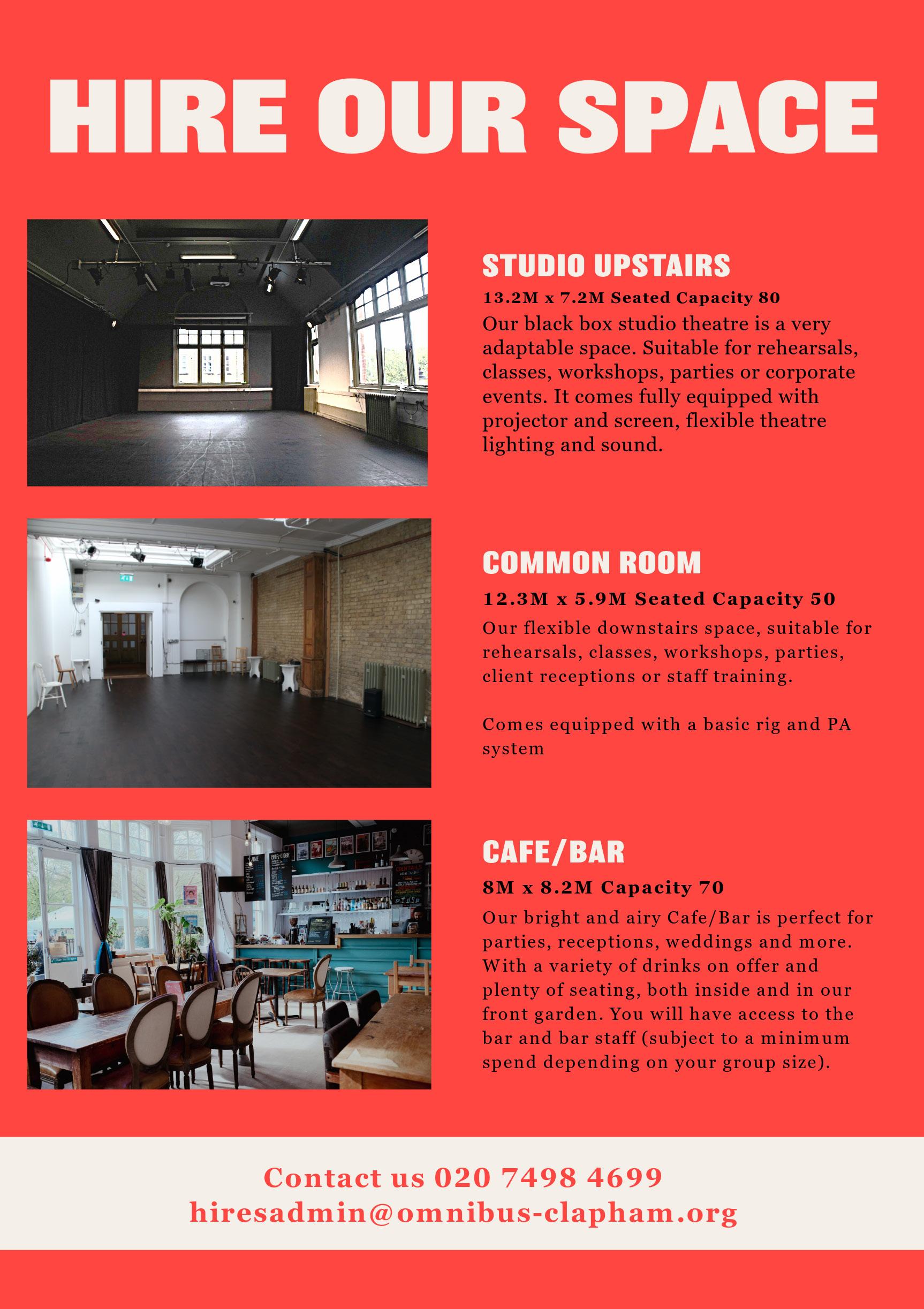 Our brand new Café Bar is the perfect relaxed spot to unwind before or after a show, to hang out with friends, have meetings or to just sit and watch the world go by. By night a buzzing hive of audiences and artists enjoying pre or post show meals as well as the fully stocked bar of craft beers, wine and seasonal cocktails. Visit omnibus-clapham.org/ cafe-bar for seasonal menu's and opening hours.