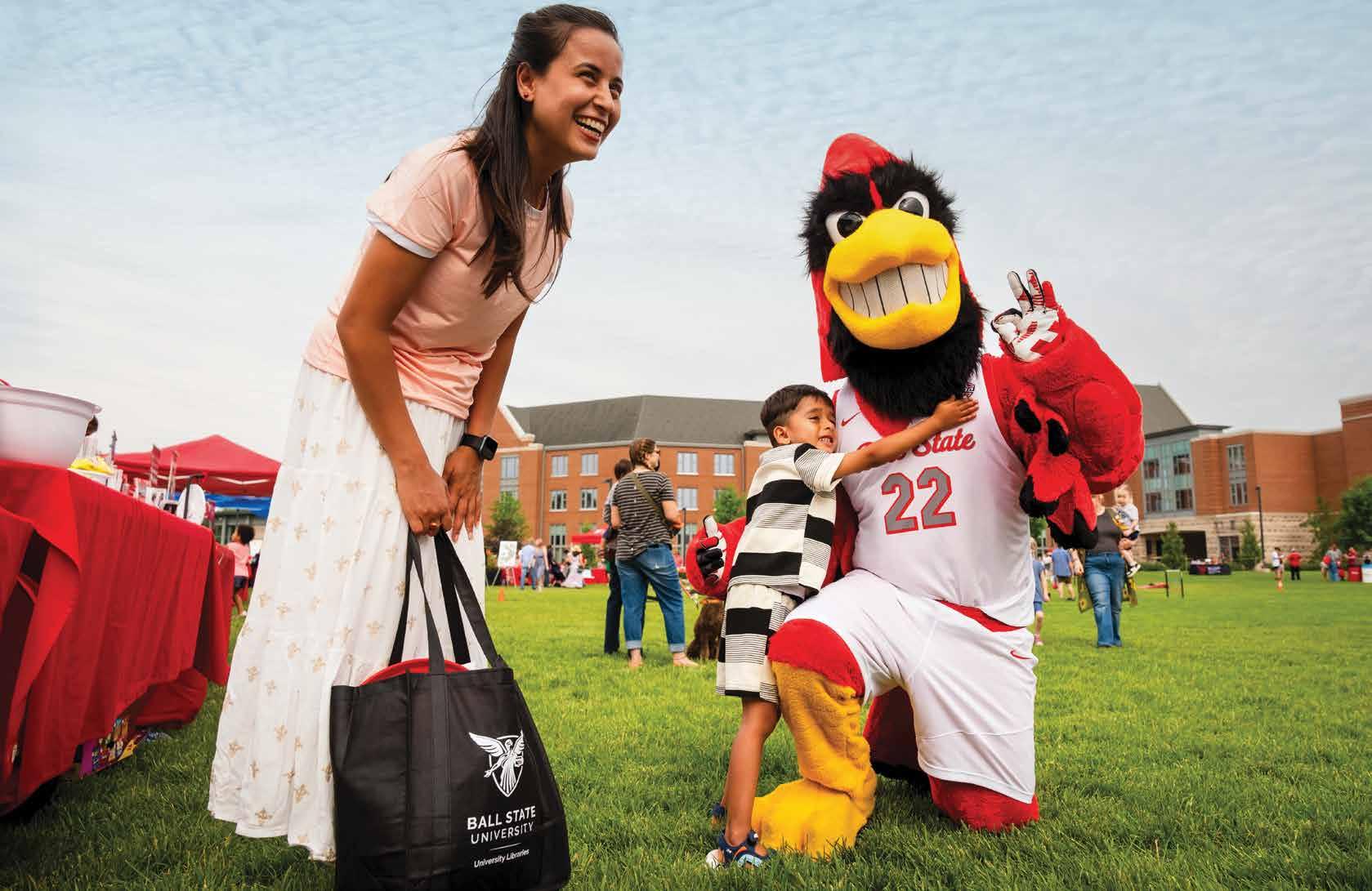 Families from the Muncie community gathered on campus in June at Ball State’s inaugural We Fly Fest to enjoy ice cream, food trucks, games, campus tours, and giveaways. Dozens of campus partners hosted activities and information tables, highlighting the University’s welcoming Cardinal spirit. Kids donned free shirts and played on the Brown Family Amphitheater lawn, while visitors enjoyed a lively performance by the Ball State Studio Band.