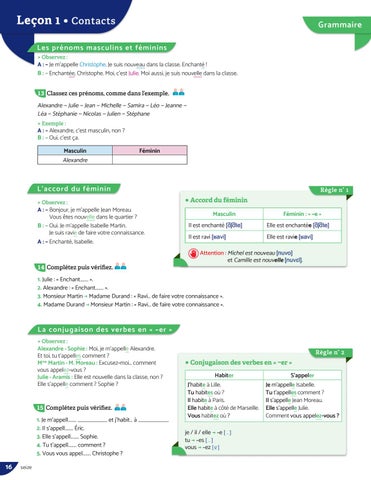 A : – Je m’appelle Christophe. Je suis nouveau dans la classe. Enchanté ! B : – Enchantée, Christophe. Moi, c’est Julie. Moi aussi, je suis nouvelle dans la classe. 13 Classez ces prénoms, comme dans l’exemple.