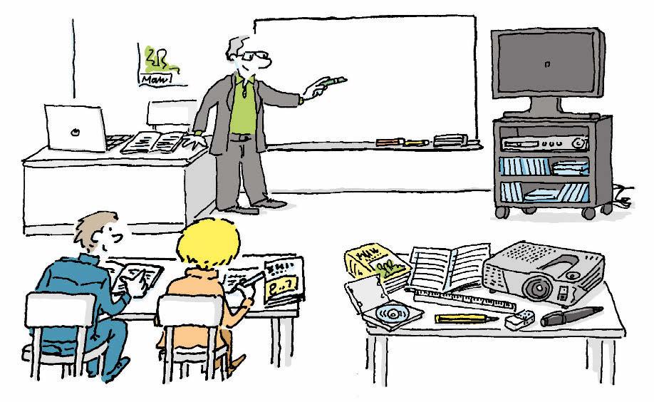 Il y a aussi : un tableau (pour écrire), un bureau (pour le professeur), des tables (f) et des chaises (f) (pour les élèves), une télévision, un lecteur de CD et un lecteur de DVD. Les élèves peuvent être en présentiel ou en classe virtuelle (à distance).