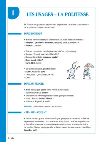DIRE BONJOUR • Si vous ne connaissez pas bien quelqu’un, vous dites simplement : – Bonjour… (madame / monsieur / Isabelle), dans la journée ; et – Bonsoir…, le soir. • Si vous connaissez bien la personne, si c’est un(e) ami(e) : – Bonjour / Bonsoir, ma chère Mathilde ! – Bonjour, Bénédicte, comment vas-tu ? – Bien, merci, et toi ? – Ça va bien, merci. • La même situation, plus familière : – Salut*, Mathilde, ça va ? – Tiens, salut ! Ça va, merci, et toi ? – Ça va !