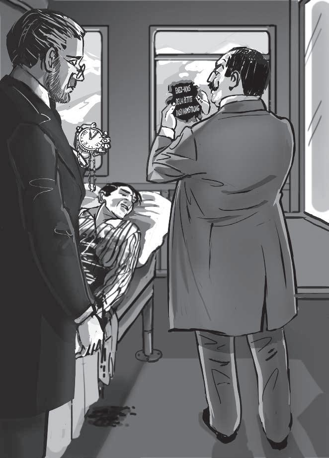 Il glisse la main sous l’oreiller et sort le petit revolver que Ratchett lui a montré la veille. Le docteur et Poirot regardent autour d’eaux. Sur la petite table, il y a un verre, un cendrier contenant le bout d’un cigare, un morceau de papier un peu brûlé et deux allumettes qui ont servi. Le docteur sent le verre vide.