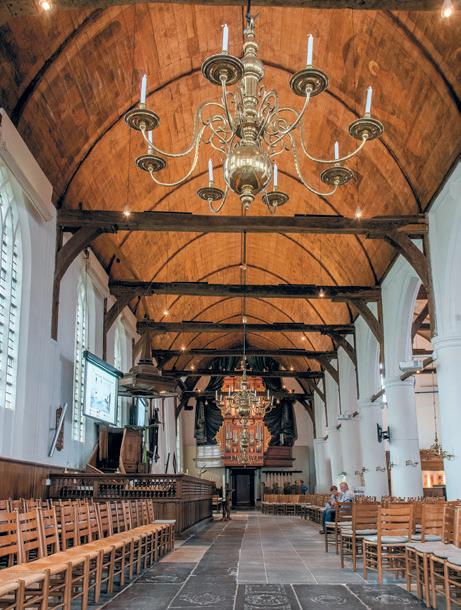Wer die Wendeltreppe zum Südportal hinaufsteigt, fühlt sich um 400 Jahre in die Vergangenheit versetzt. Dort befindet sich die Librije van Enkhuizen, eine Stadtbibliothek aus dem 17. Jahrhundert, sowie der historische Kirchenratssaal – mit Goldledertapeten, bunten Glasfenstern und einem biblischen Fliesentableau aus etwa 1740.