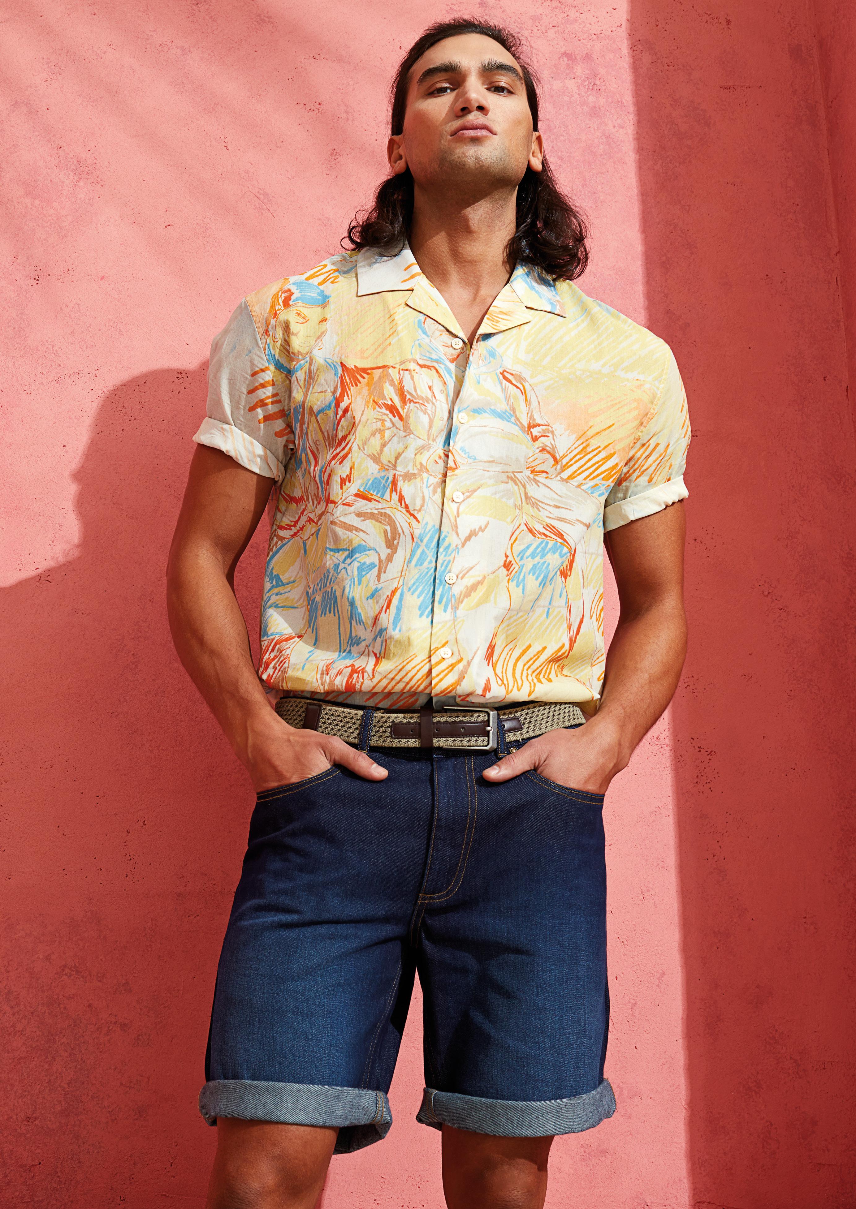The men’s palm print shorts, a timeless style for summer. Crafted from a soft and lightweight cotton to keep you cool. Featuring a comfortable fit with palm print design, zip fly, rollable hems and a contrasting button. Try styling these shorts with anything from a bright t-shirt for coastal days or a shirt for smarter weekends.