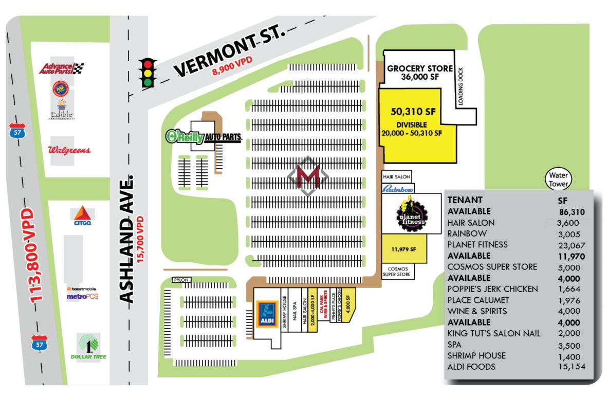 This high visibility ALDI-anchored retail center is located beside the heavily trafficked Ashland & Vermont Ave intersection. This established retail hub pairs national draw with everyday convenience. Co-tenancy includes Planet Fitness, Rainbow, and other neighborhood favorites.