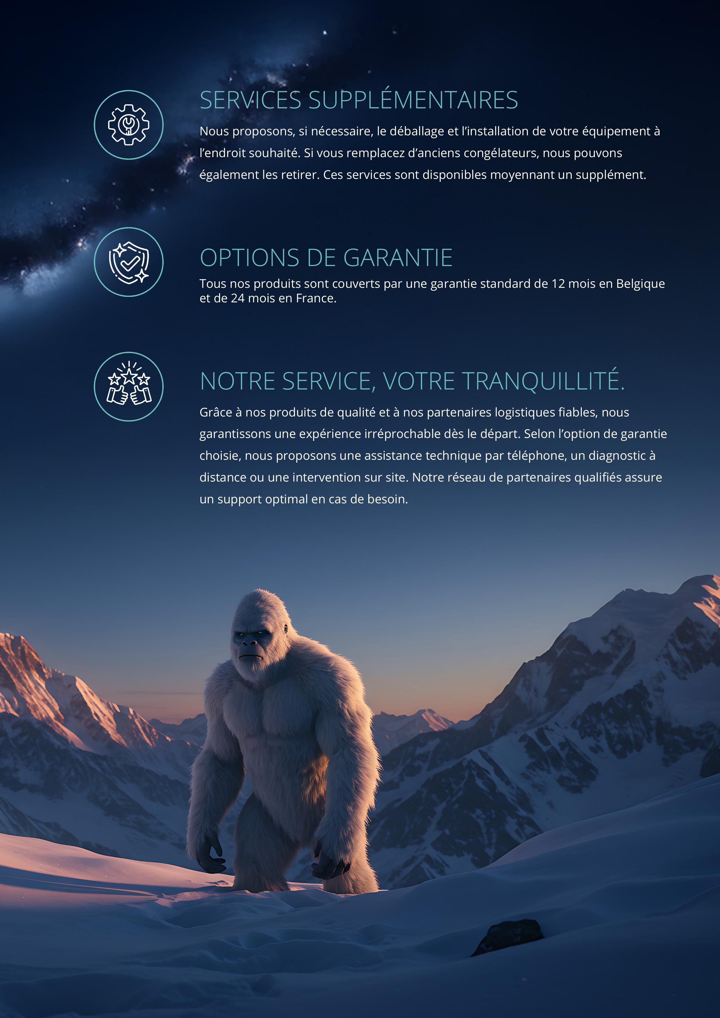 Il est recommandé de conserver les produits congelés entre -18 et -22°C bien que certains peuvent être conservés à -14°C pour faciliter le service. Nous fournissons également des congélateurs coffres spécialisés pouvant descendre jusqu'à -45°C.