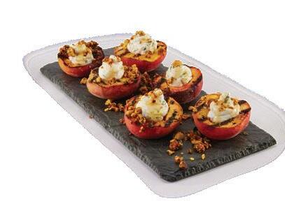 Juicy peaches stuffed with creamy chèvre and topped with honey and spiced hazelnuts.